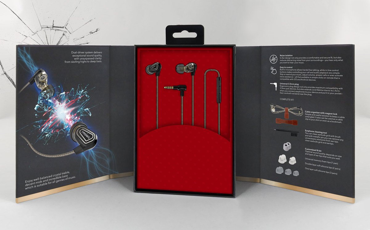 Розробка дизайну упаковки навушників Dual Driver Earbuds, модель - Immersive bass Q8 (Made in Hong Kong). Дизайн розробленої упаковки навушників підкреслює їх особливості (наведені нижче). Бренд INTALEO, створений нашою студією, є яскравим прикладом креативності, яка проявляється у дизайні його упаковки. Цікава, солідна, інноваційна та помітна упаковка завжди виділяється серед конкурентів та привертає увагу споживача завдяки продуманому та функціональному дизайну.
