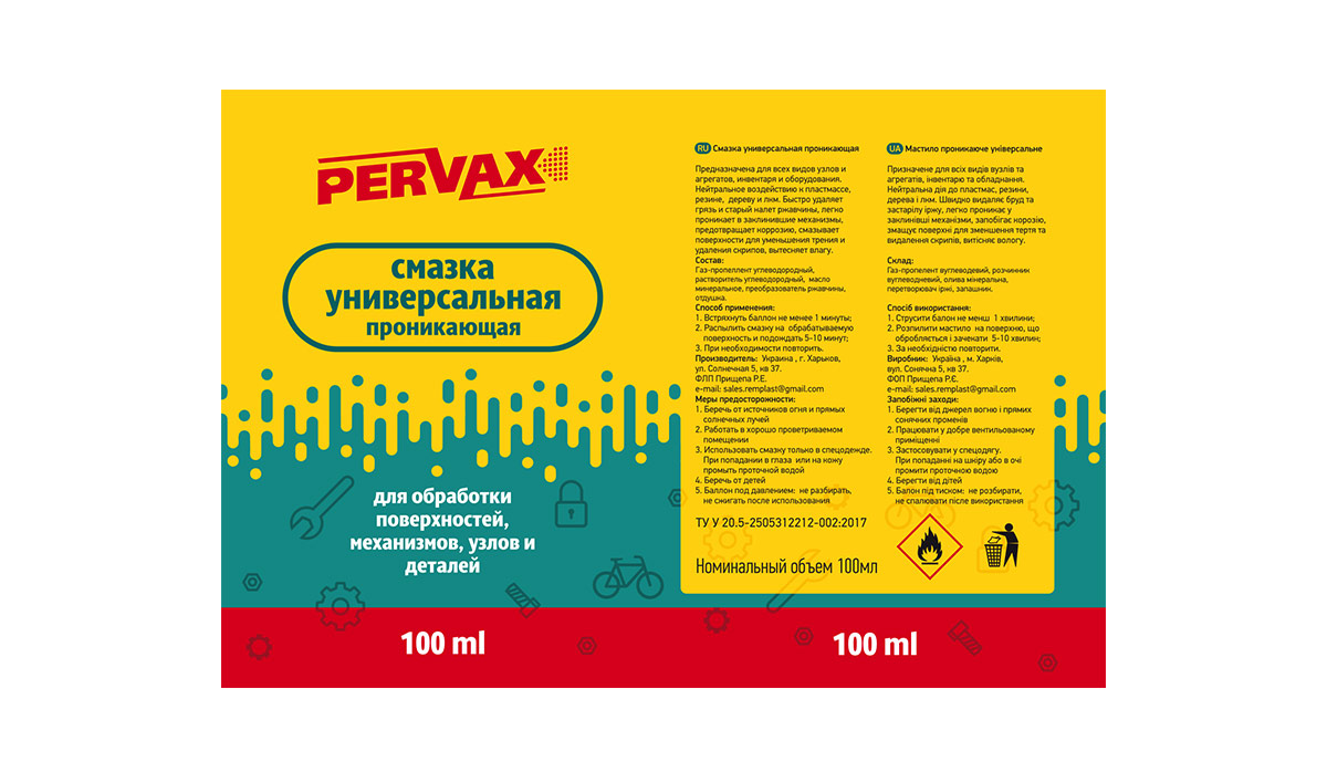 В основі дизайну етикетки лежить унікальний фірмовий стиль, який відображає динаміку застосування та роботи мастила універсальної проникаючої – вертикальні лінії та точки, що переходять з одного кольору в інший. У стилі використані елементи, з якими працює мастило – велосипед, замок, гайка, розвідний ключ, шестірня тощо. Колірне рішення – червоний, жовтий та темно-бірюзовий було обрано, як унікальне для цієї сфери діяльності (бо в основному всі використовують кольори WD-40 – синій та жовтий). Таким чином, за дизайном, аерозольний балон дуже сильно відрізнятиметься від усього, що знаходиться на полиці в магазині серед аналогічної продукції. В рамках замовлення були розроблені етикетки на 100, 200 та 400 мл.