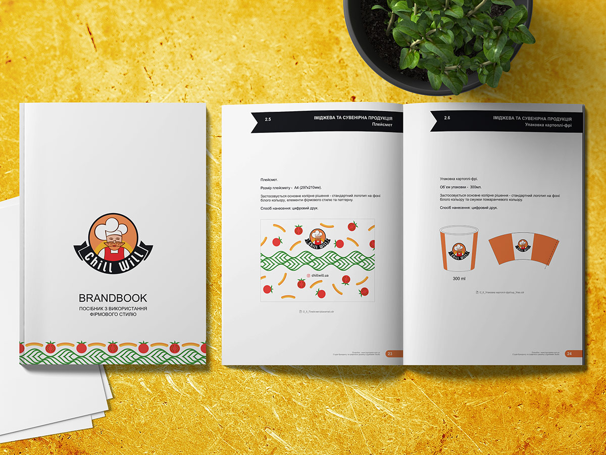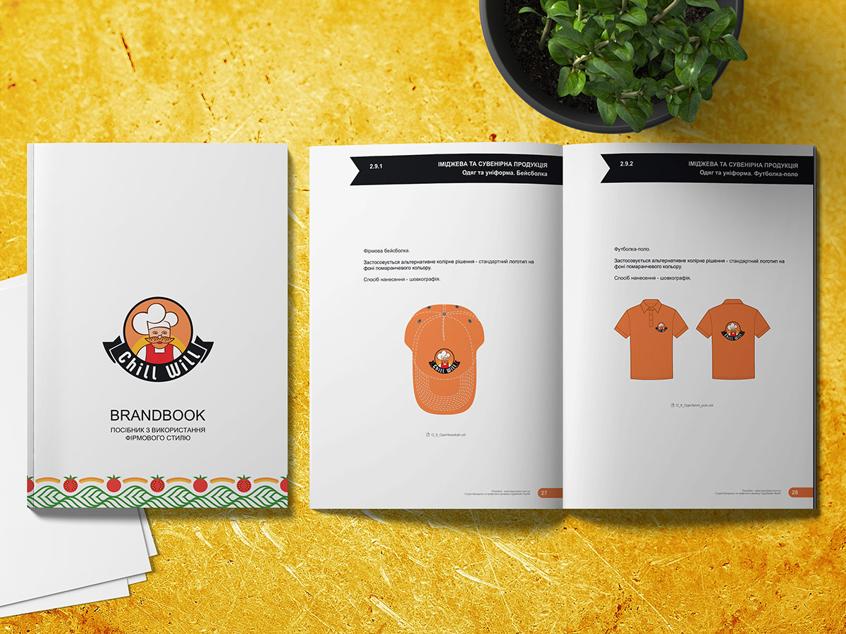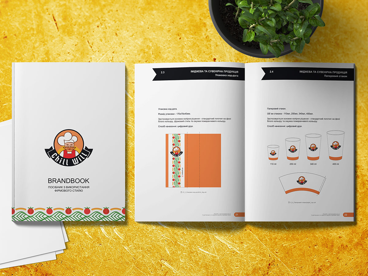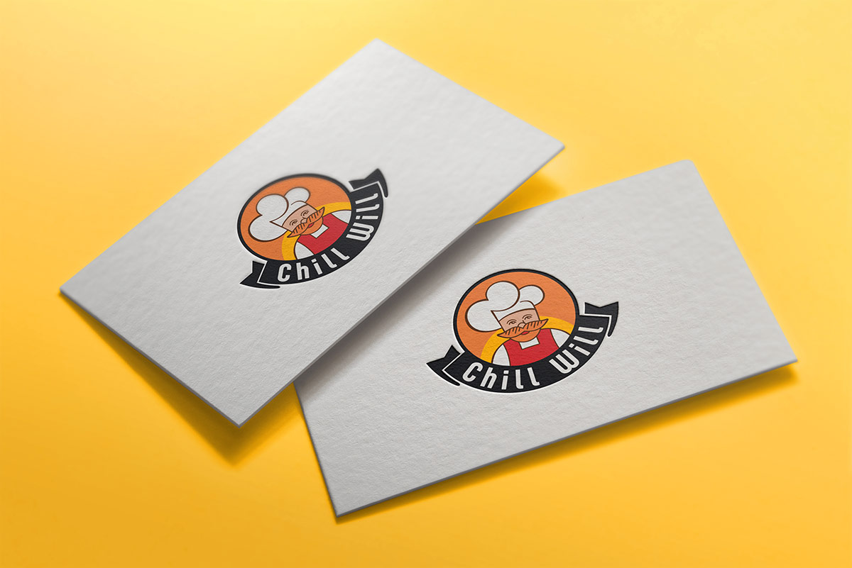 После детального обсуждения различных вариантов Заказчик утвердил нижеприведенный логотип с персонажем – добрым поваром. Шрифтовое написание названия “ChillWill” разработано дизайнерами нашей студии и выполнено в строгом стиле.