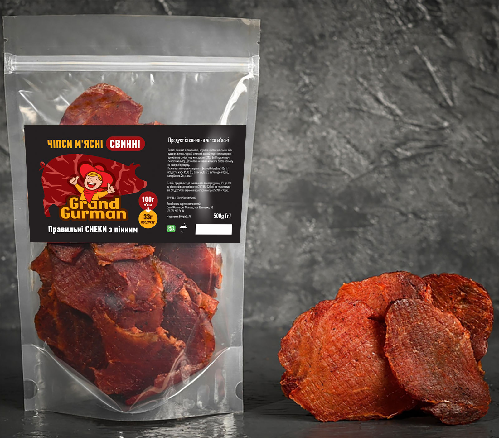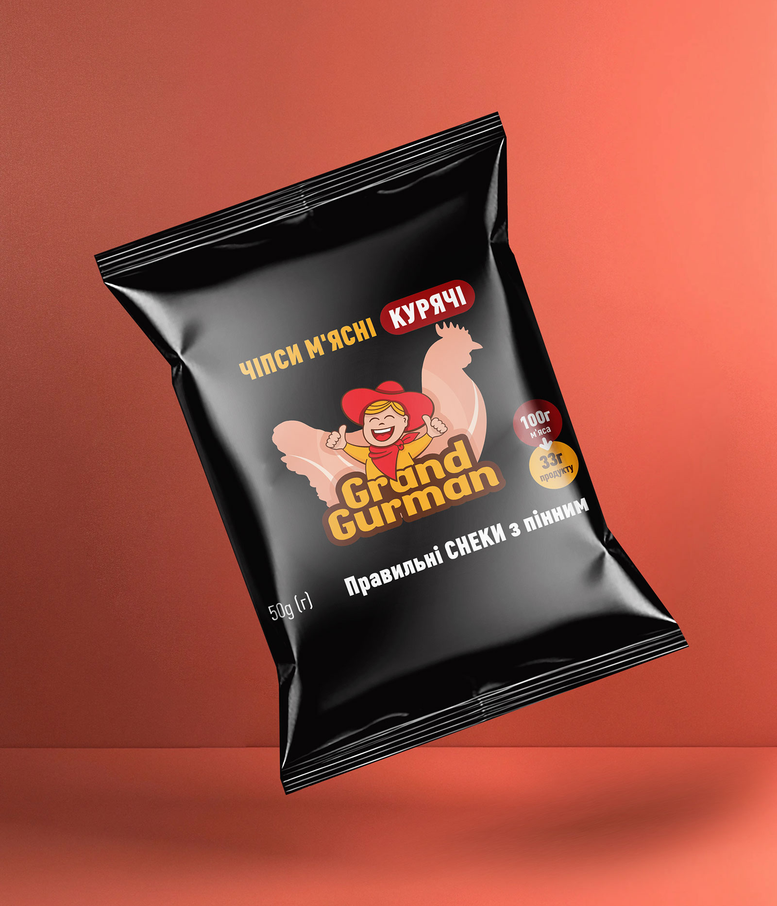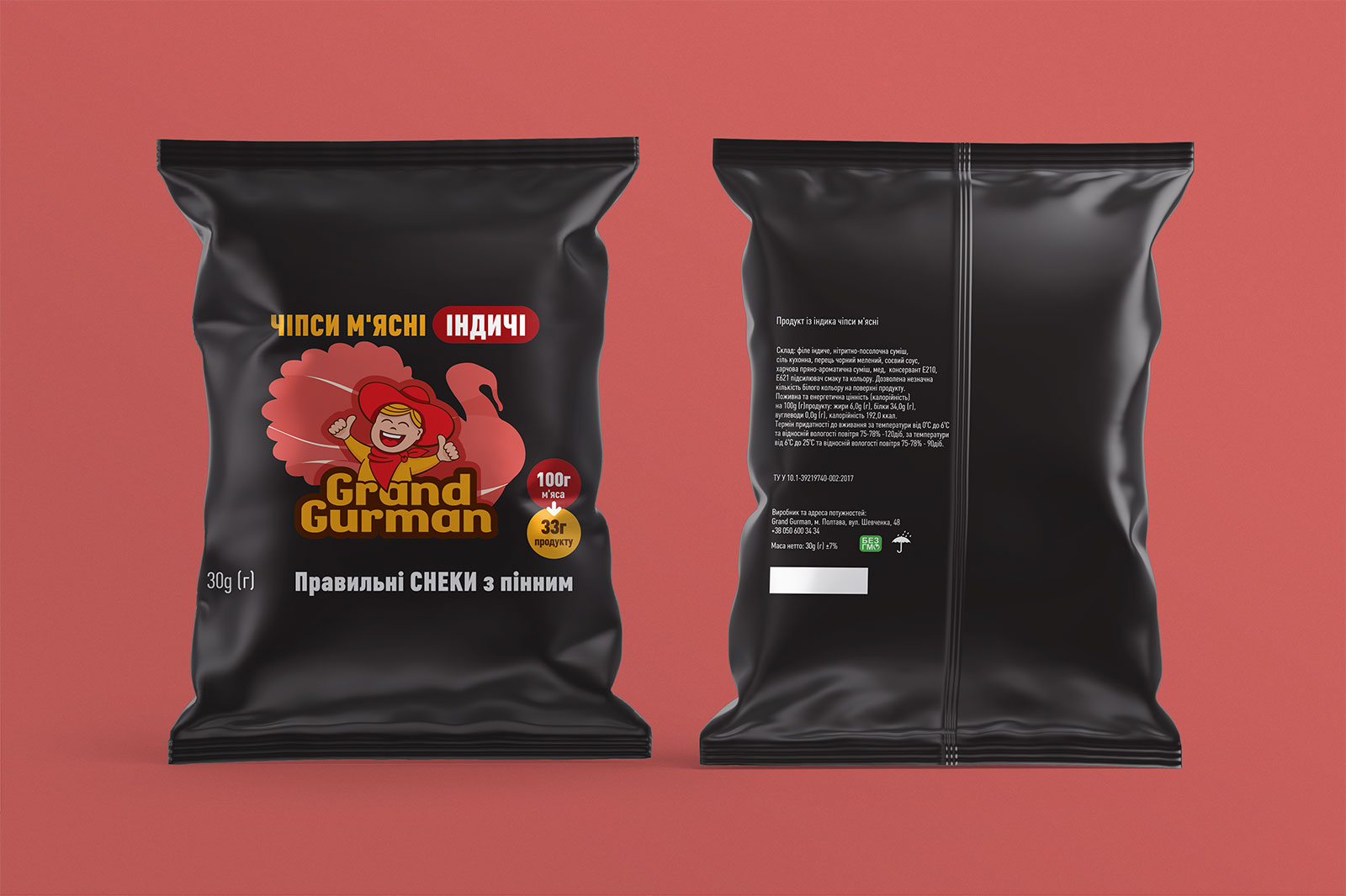 Разработка названия, логотипа, дизайна этикетки для мясных снеков (Украина).