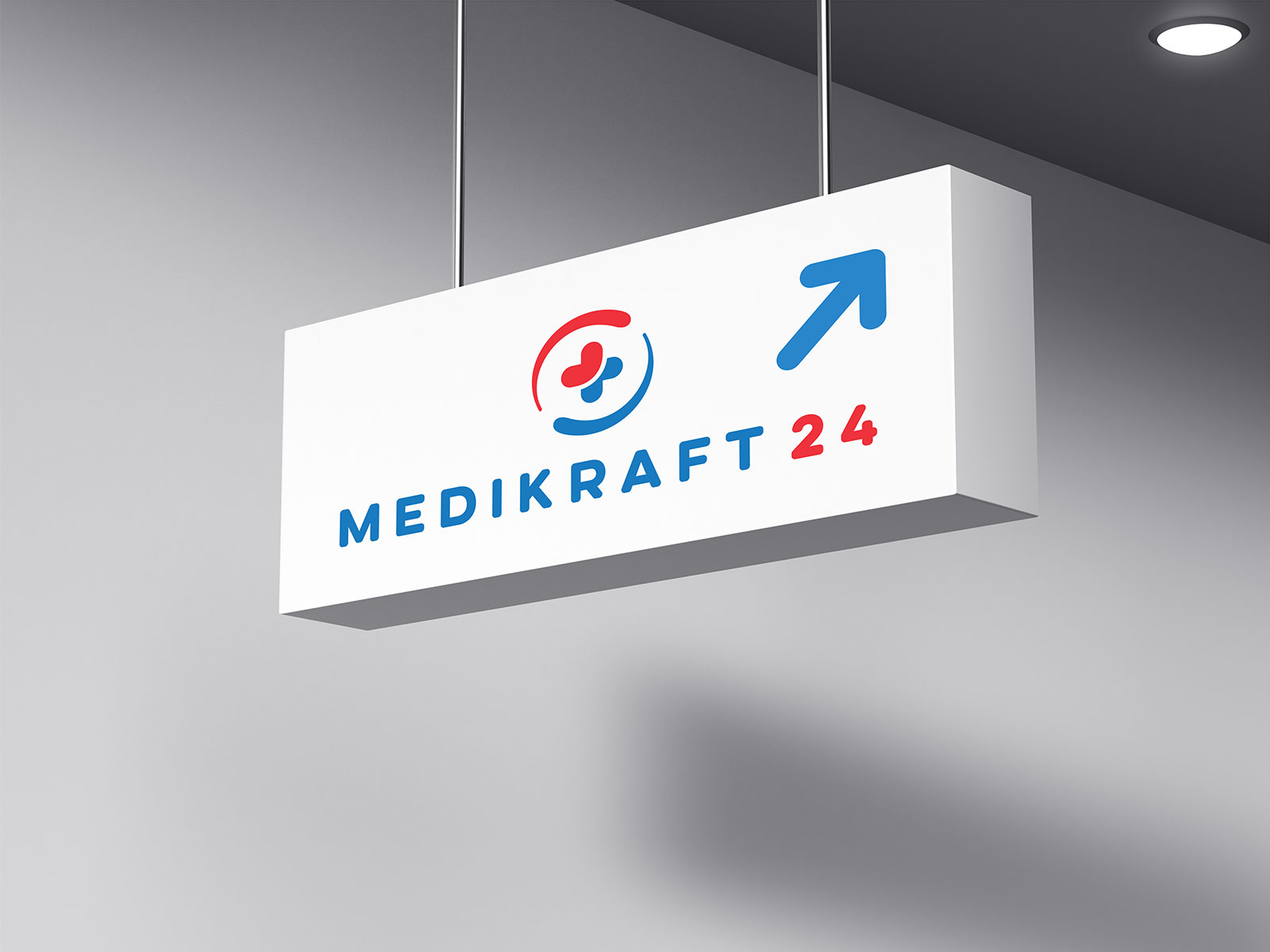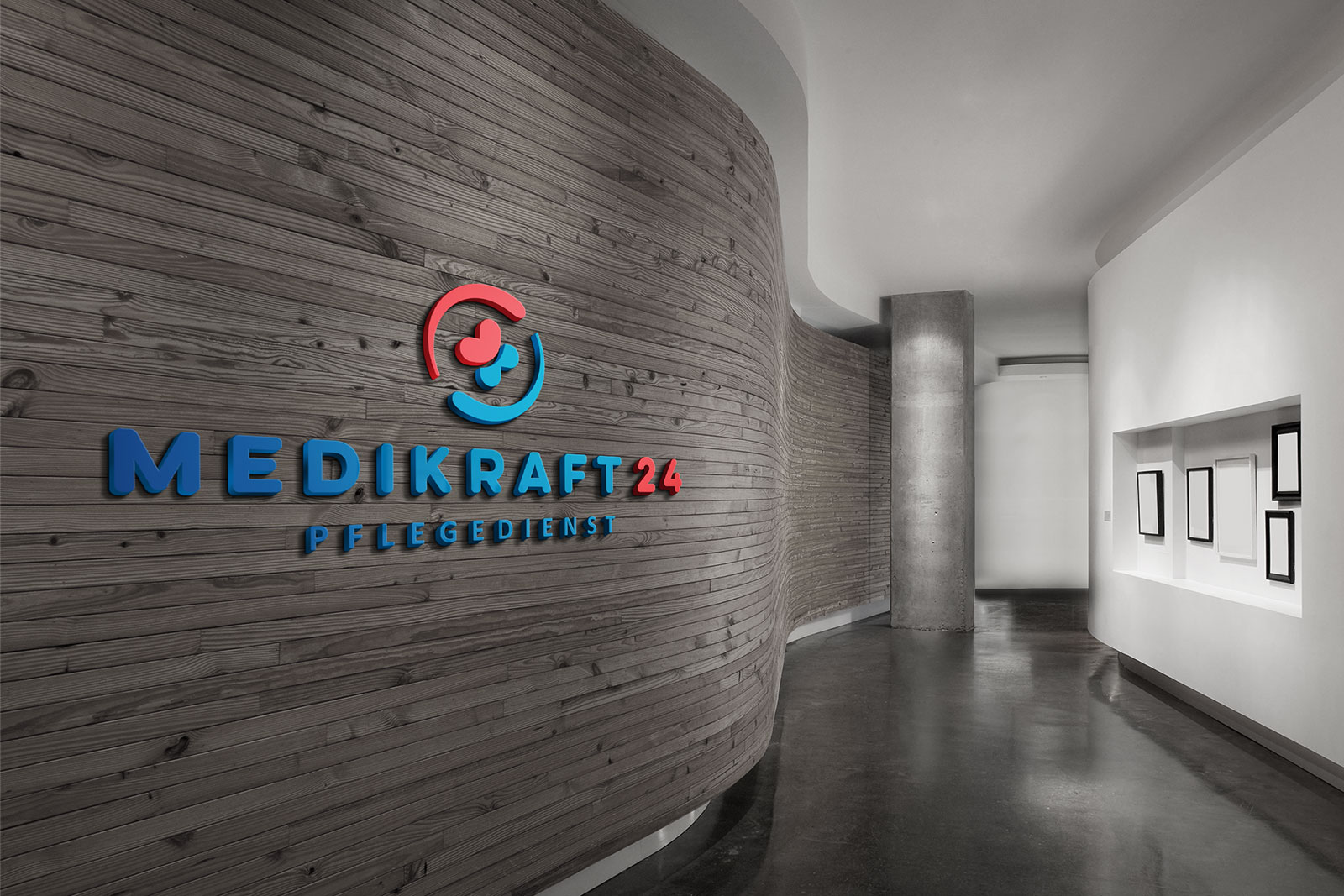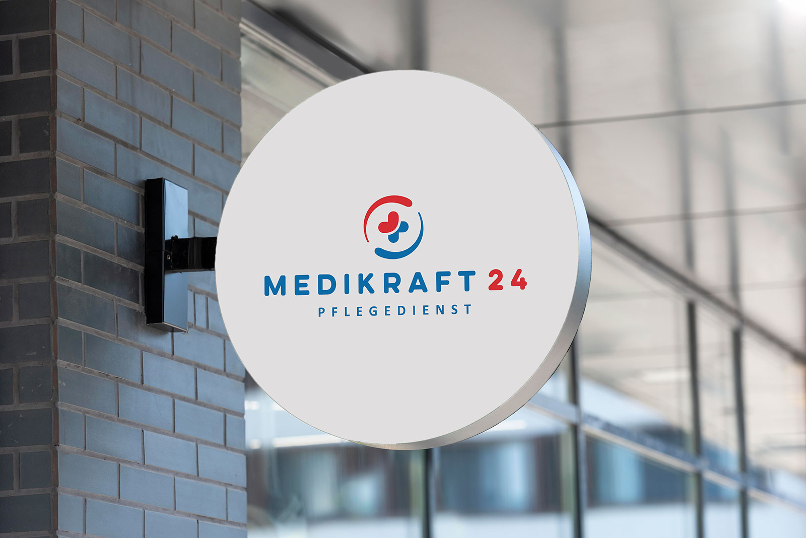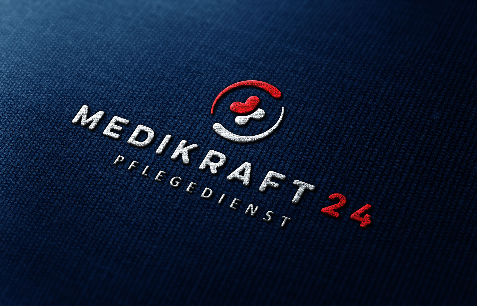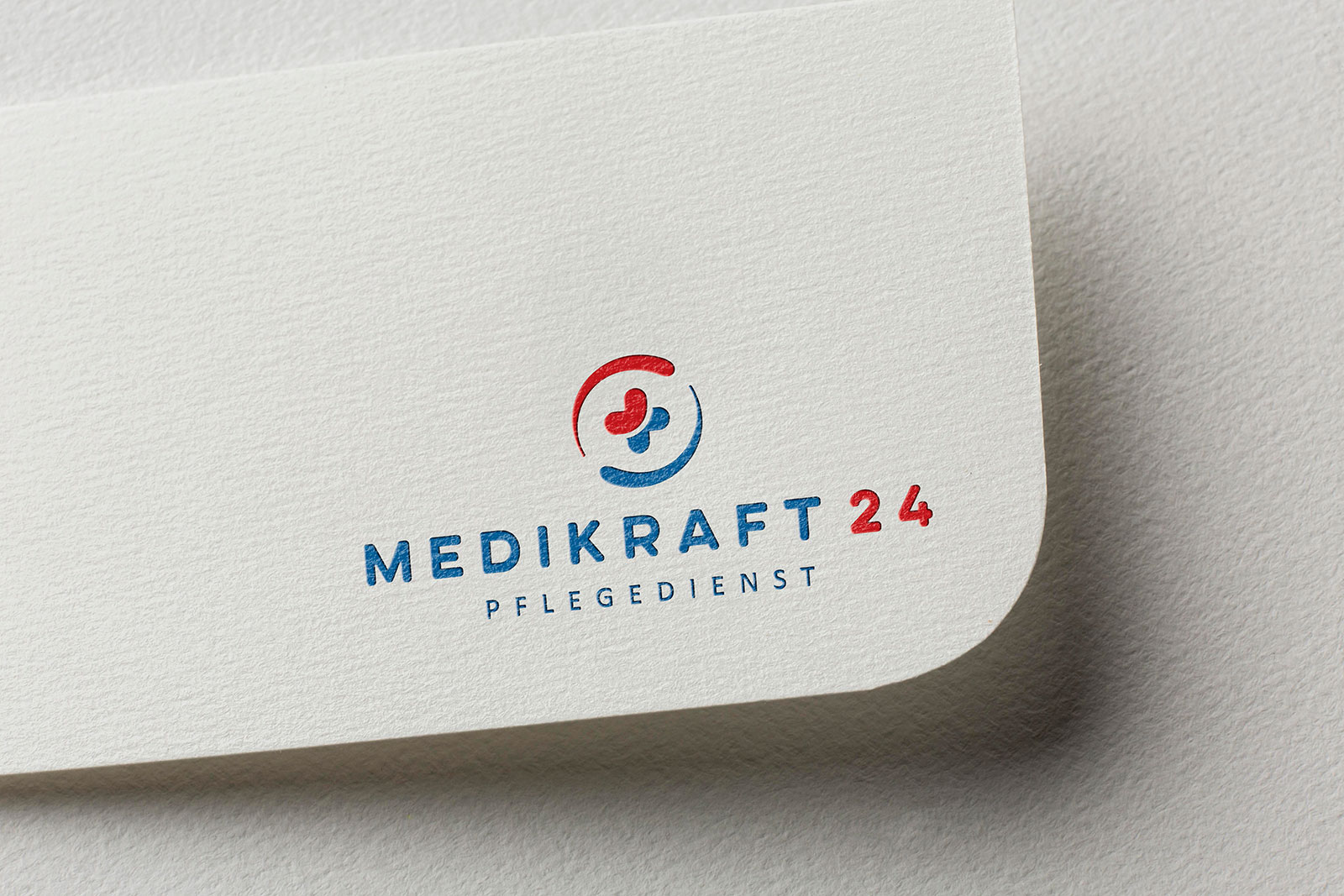 Шрифтовое написание названия “MEDIKRAFT24” разработано дизайнерами нашей студии и выполнено в строгом стиле. Для расшифровки деятельности было принято использовать в логотипе дескриптор “PFLEGEDIENST” (перевод: СЛУЖБА ПО УХОДУ).