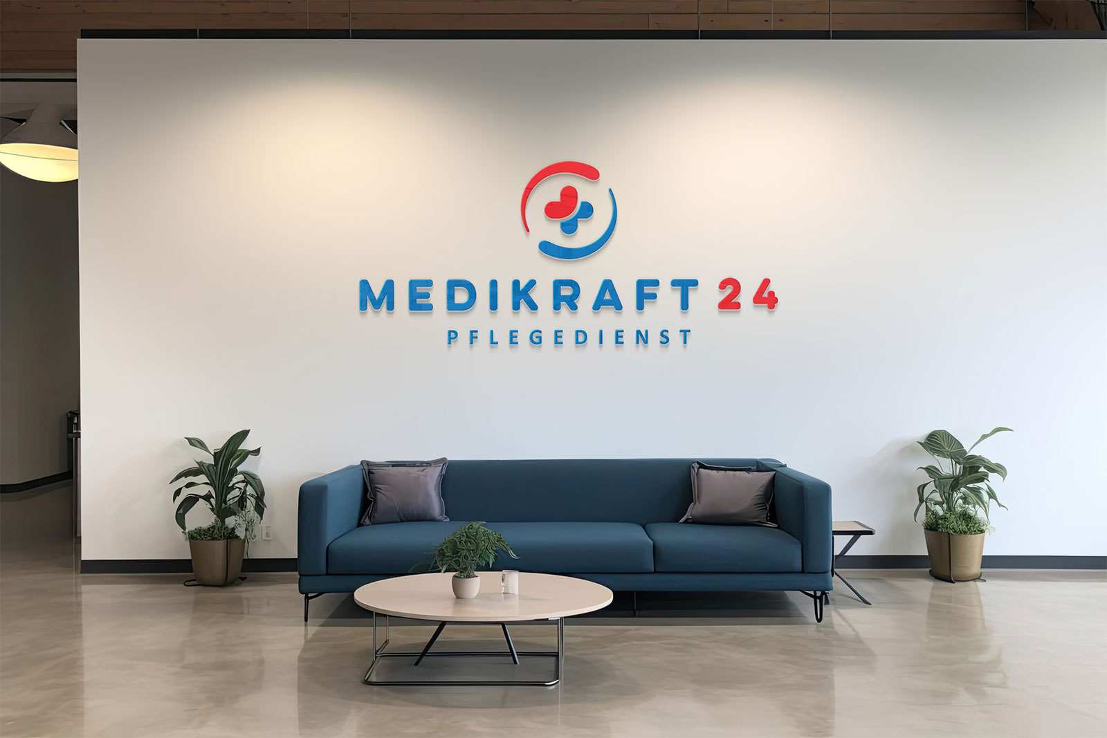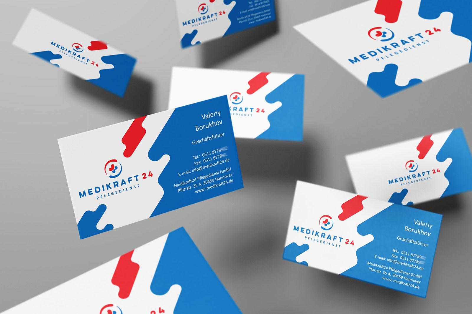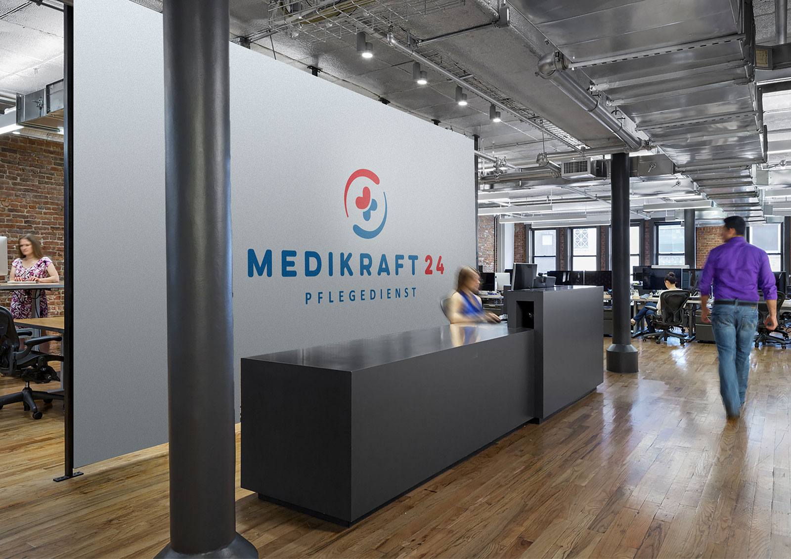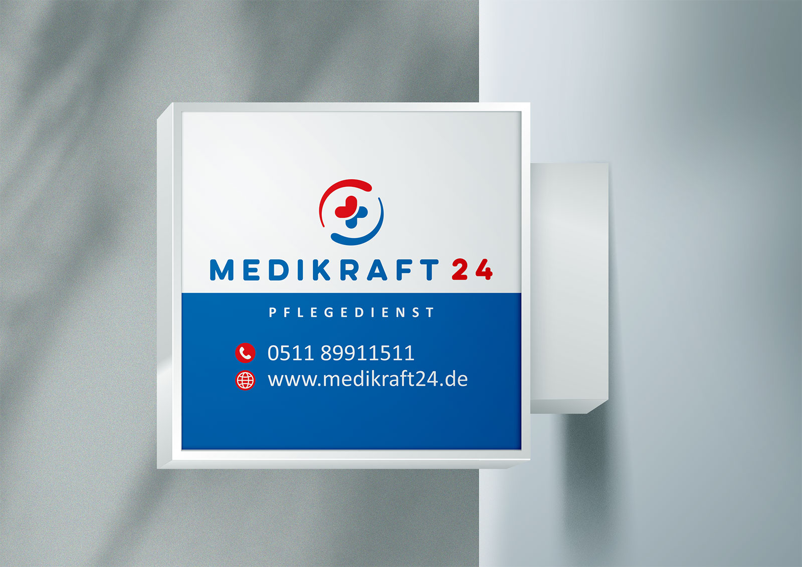 Шрифтовое написание названия “MEDIKRAFT24” разработано дизайнерами нашей студии и выполнено в строгом стиле. Для расшифровки деятельности было принято использовать в логотипе дескриптор “PFLEGEDIENST” (перевод: СЛУЖБА ПО УХОДУ).