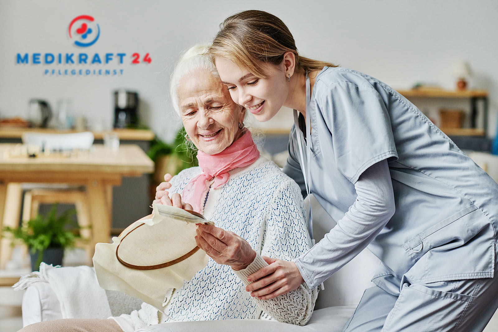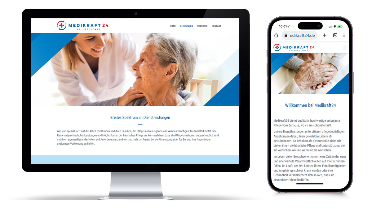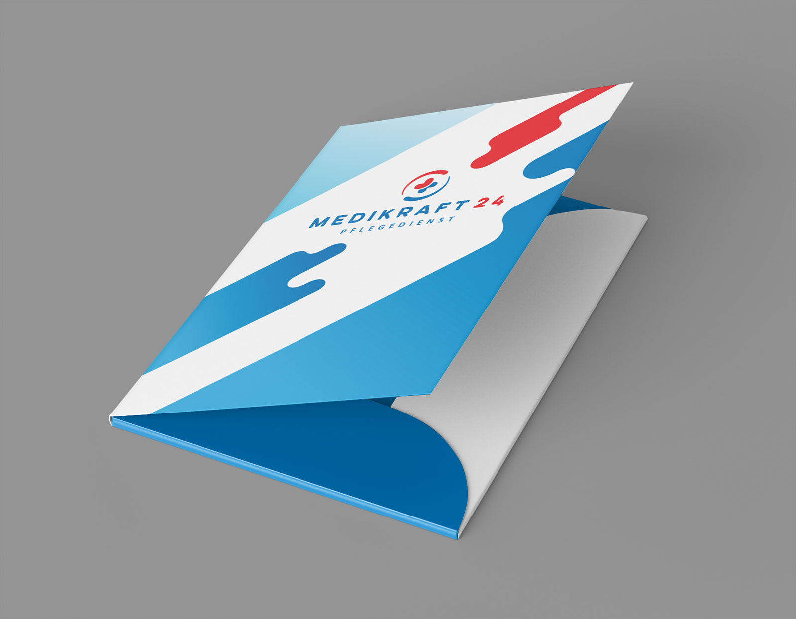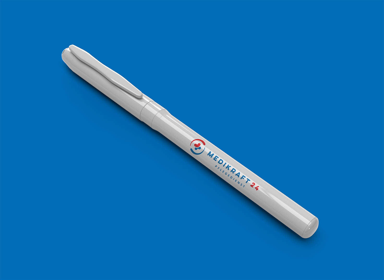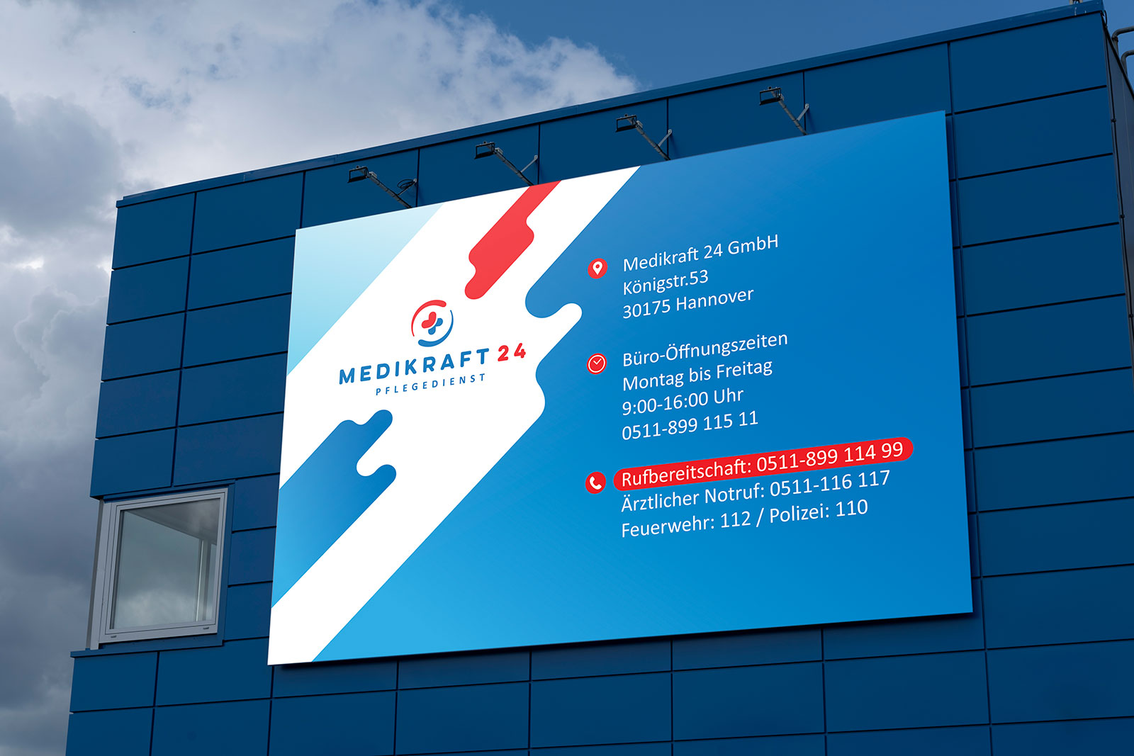 Шрифтовое написание названия “MEDIKRAFT24” разработано дизайнерами нашей студии и выполнено в строгом стиле. Для расшифровки деятельности было принято использовать в логотипе дескриптор “PFLEGEDIENST” (перевод: СЛУЖБА ПО УХОДУ).