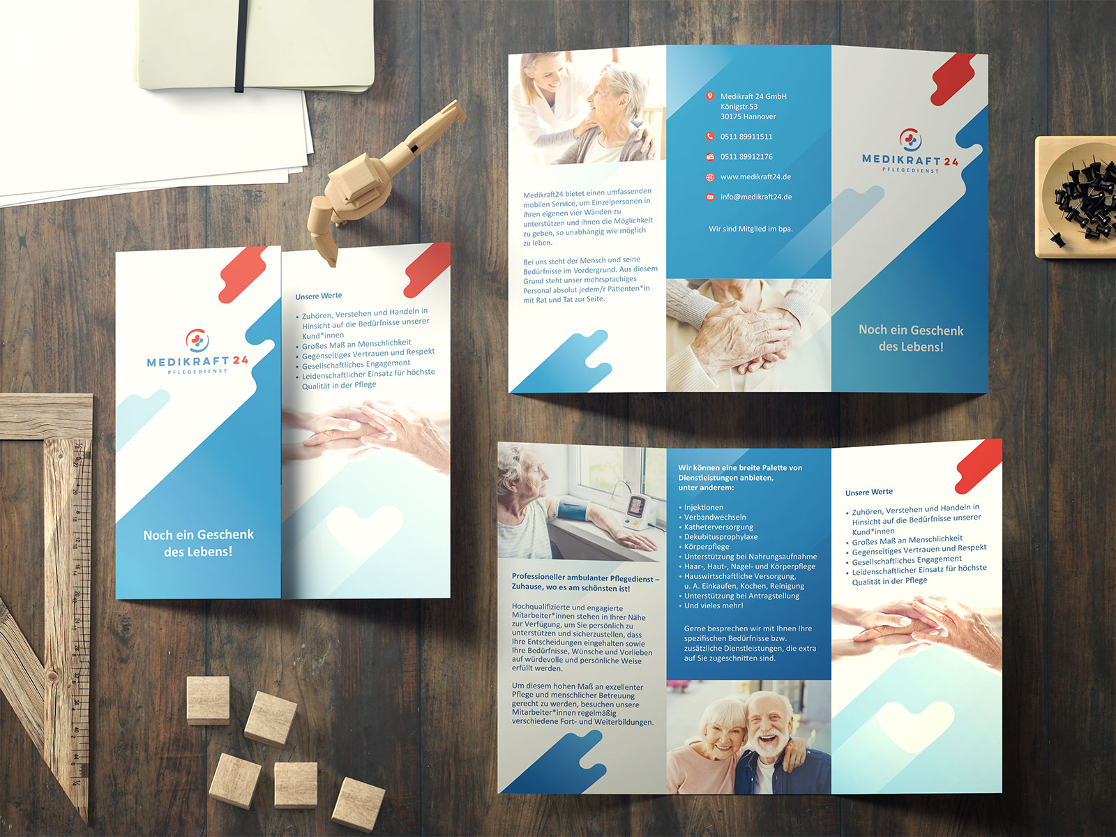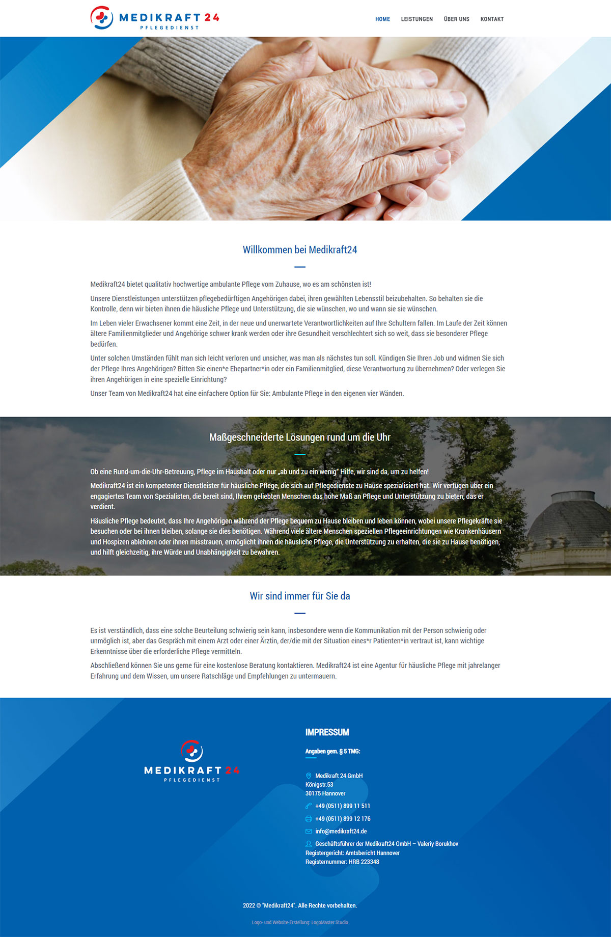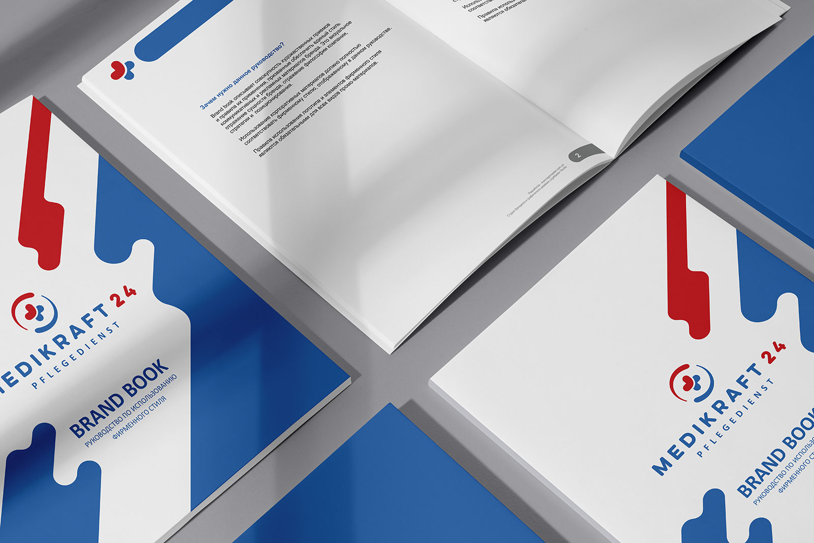 Разработка названия, логотипа, фирменного стиля, бренд бука и сайта для компании, которая занимается медицинскими услугами (уколы, выдача таблеток, перевязки) и уходом за пожилыми людьми (купание, закупка товаров, уборка квартиры, приготовление еды). Компания находится в городе Hannover, Germany.