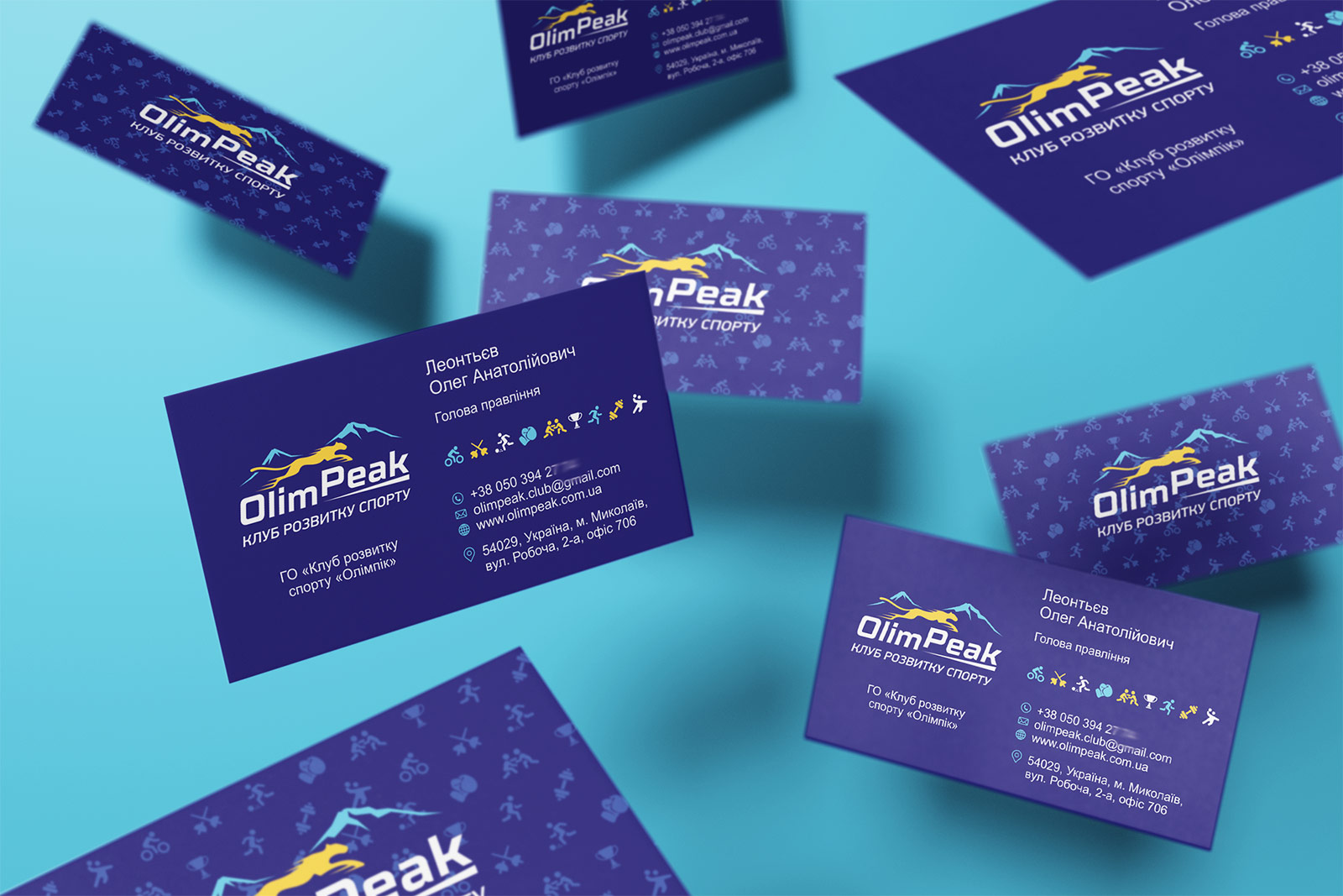 Шрифтовое написание названия “OlimPeak” разработано дизайнерами нашей студии и выполнено в строгом стиле. Для расшифровки деятельности было принято использовать в логотипе дескриптор “КЛУБ РОЗВИТКУ СПОРТУ”.