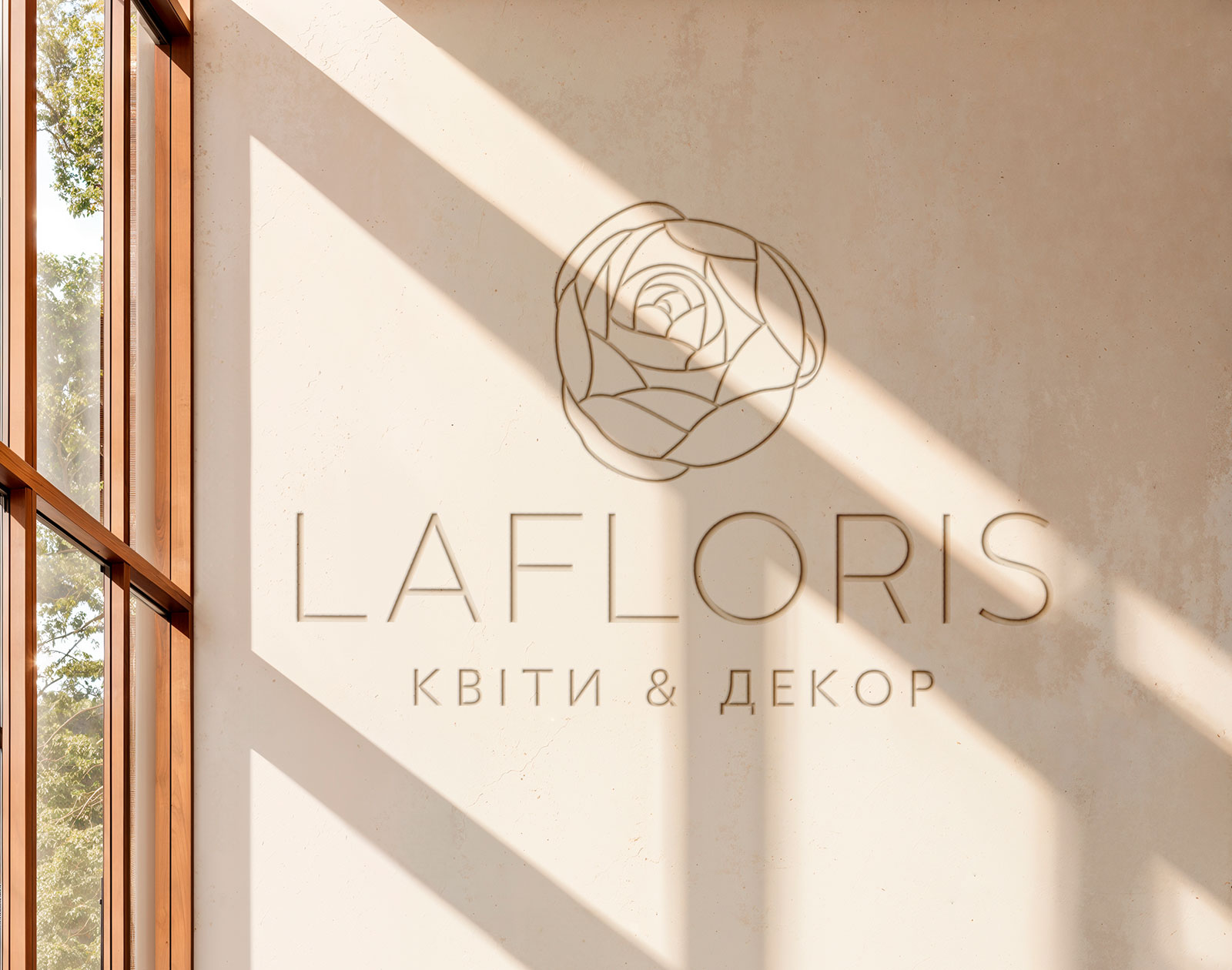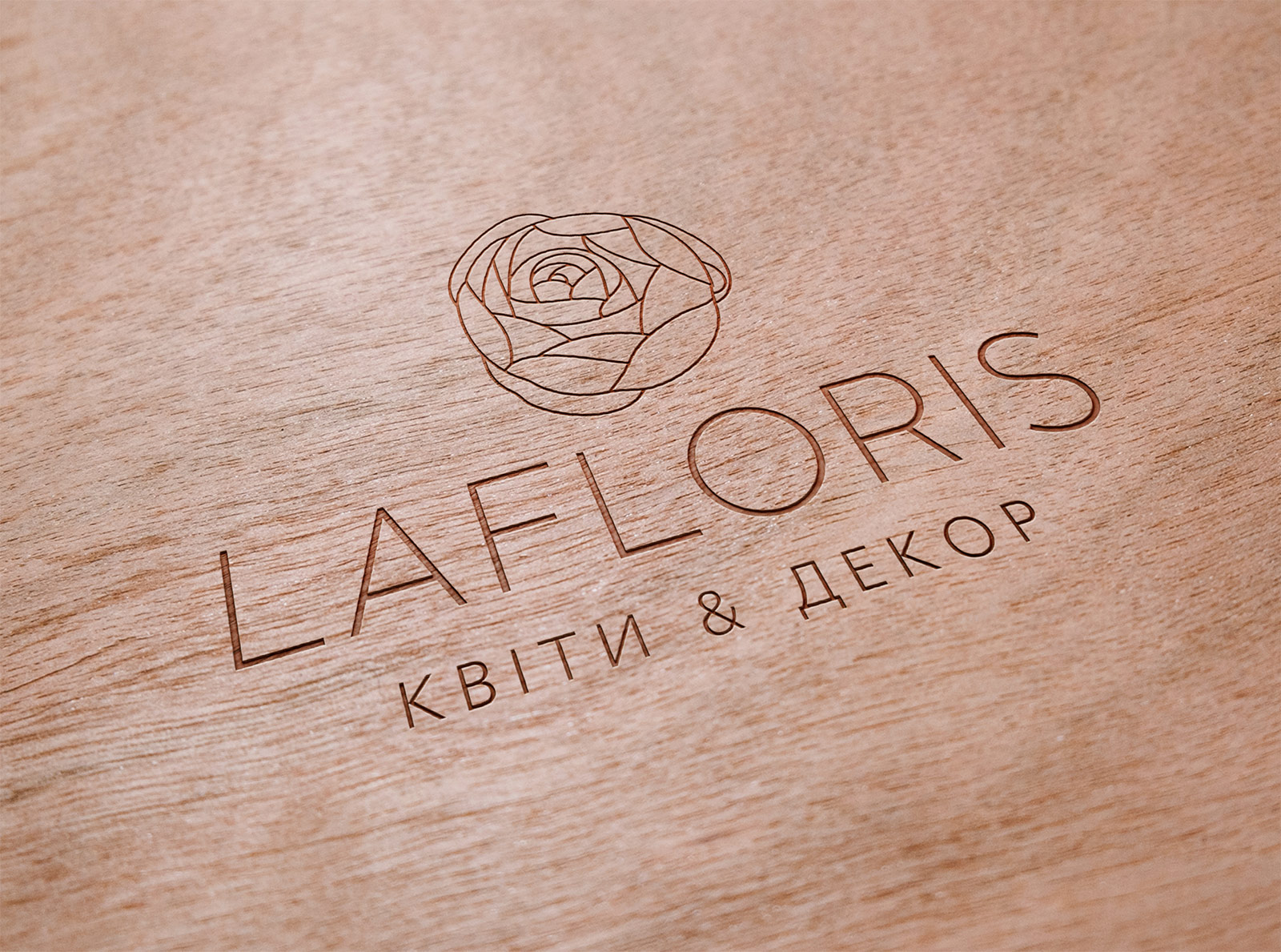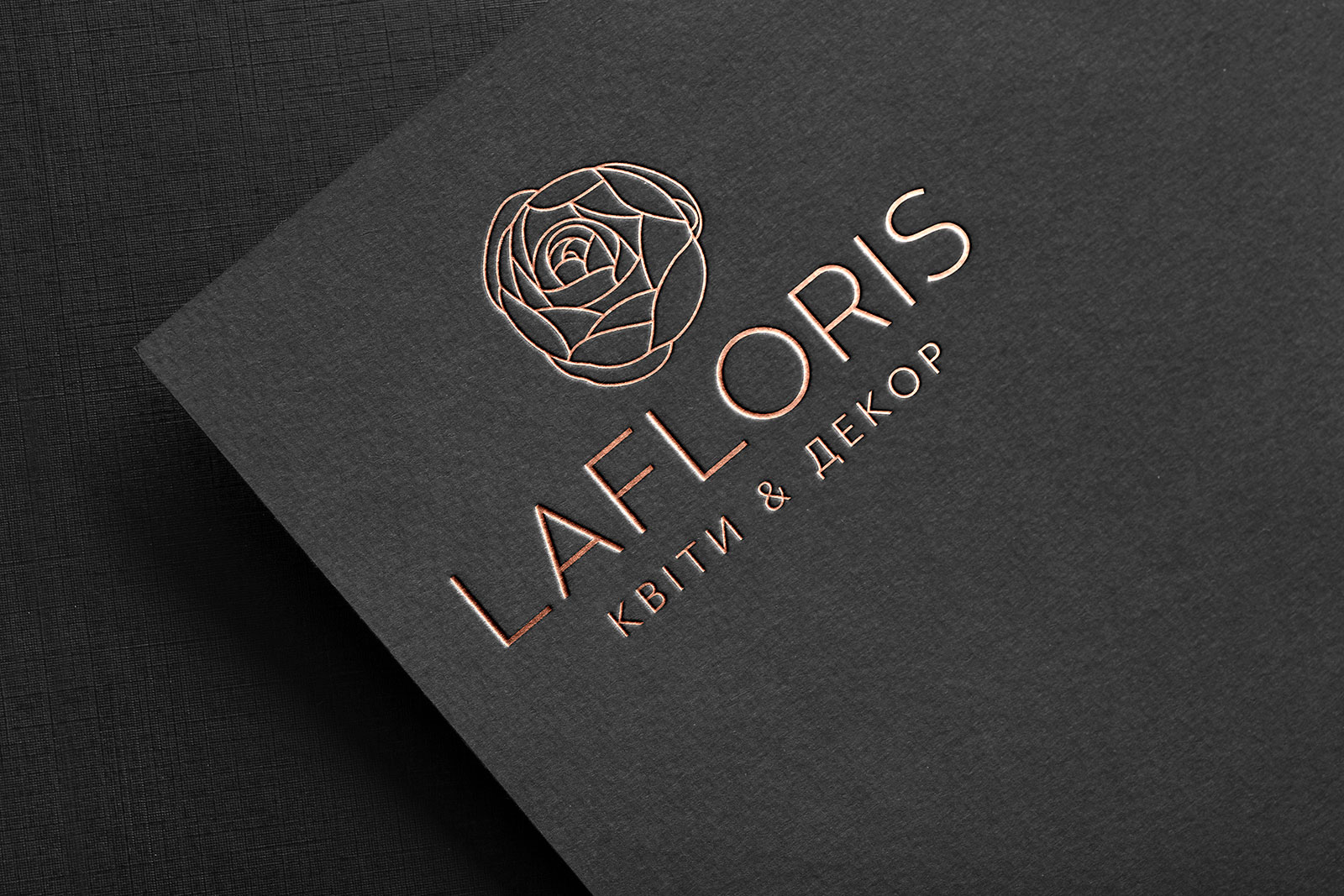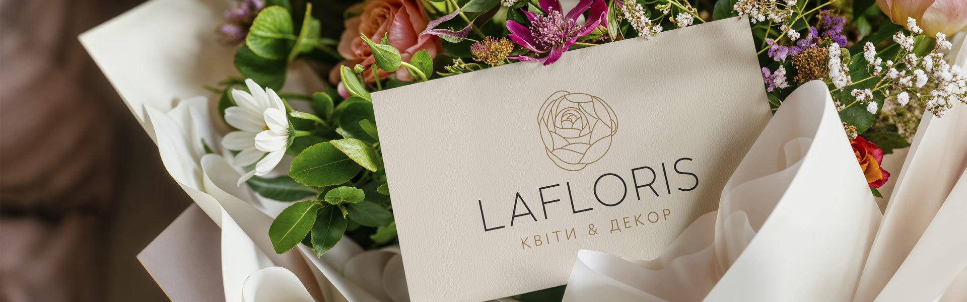 Шрифтовое написание названия “LAFLORIS” разработано дизайнерами нашей студии и выполнено в строгом стиле. Для расшифровки деятельности было принято использовать в логотипе дескриптор “квіти & декор”.