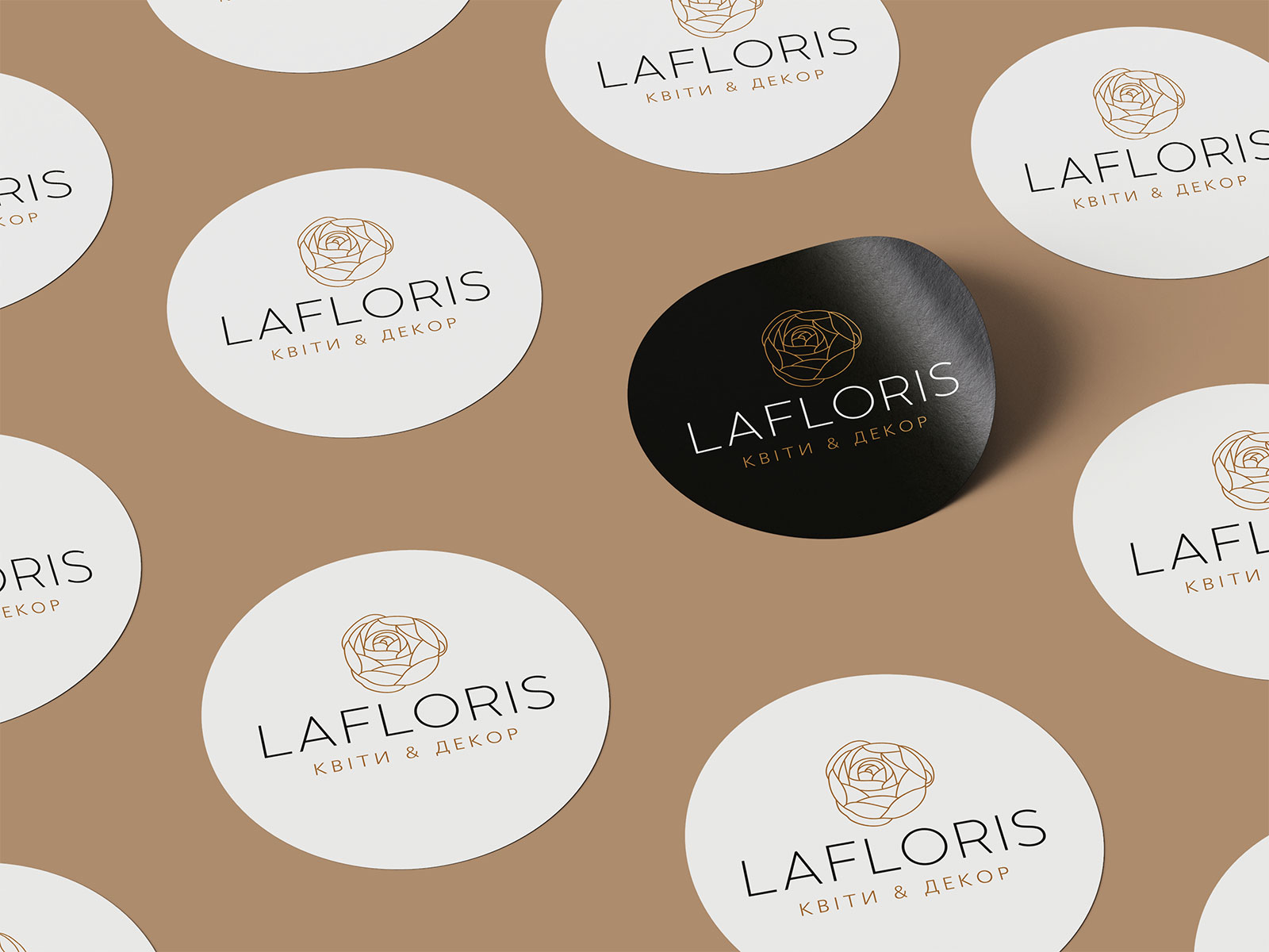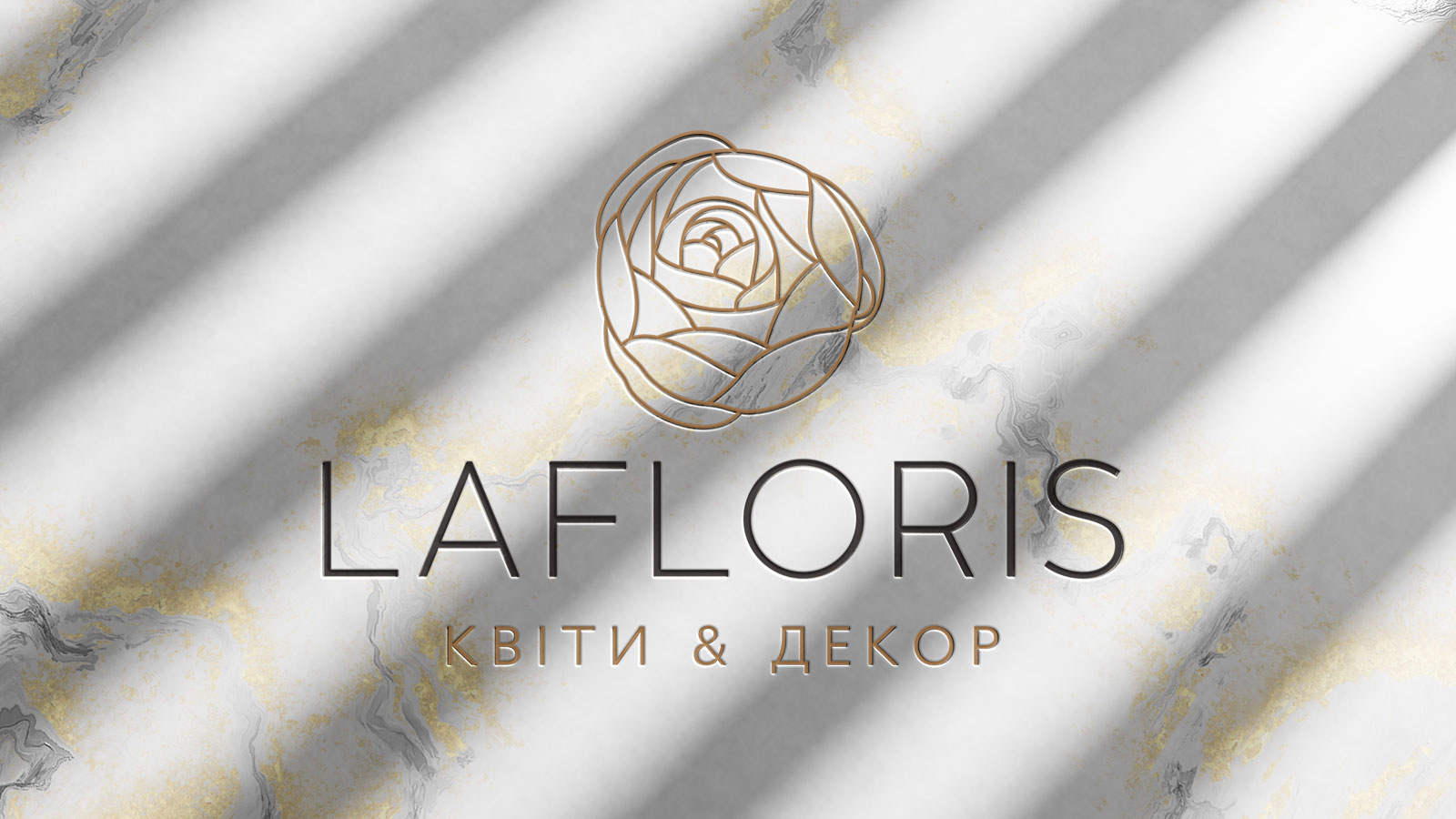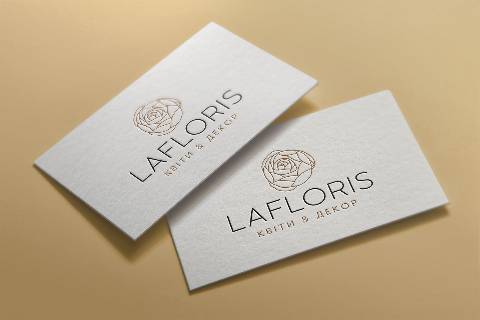 Шрифтовое написание названия “LAFLORIS” разработано дизайнерами нашей студии и выполнено в строгом стиле. Для расшифровки деятельности было принято использовать в логотипе дескриптор “квіти & декор”.