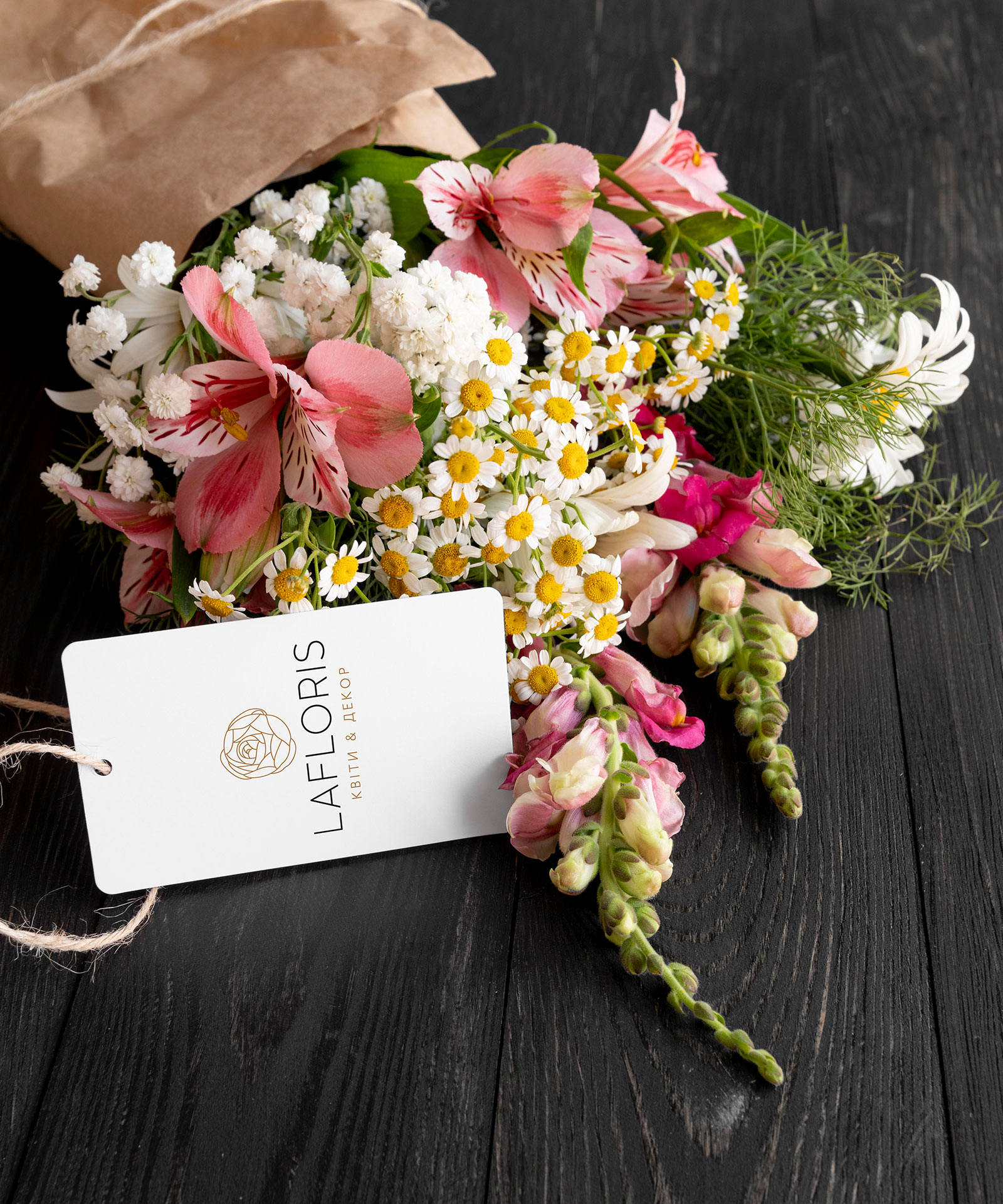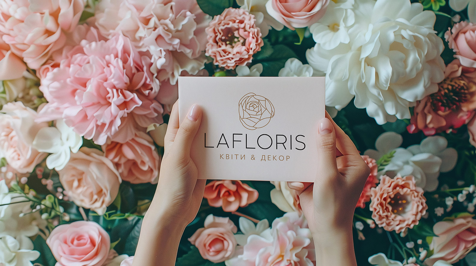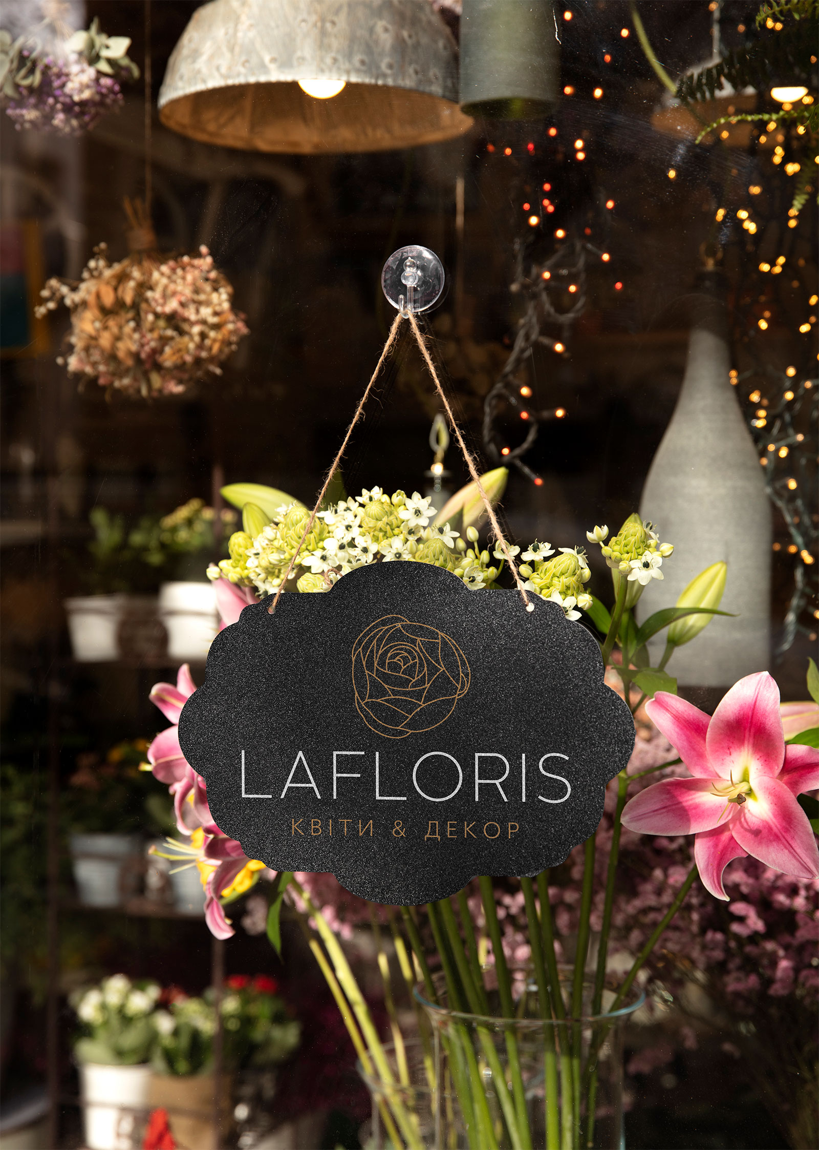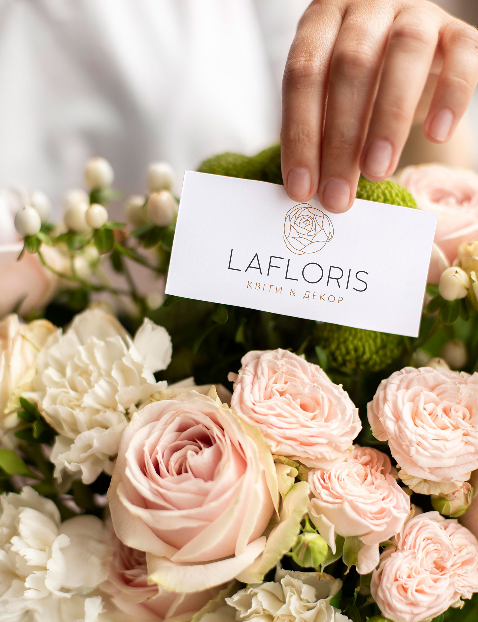 Шрифтовое написание названия “LAFLORIS” разработано дизайнерами нашей студии и выполнено в строгом стиле. Для расшифровки деятельности было принято использовать в логотипе дескриптор “квіти & декор”.