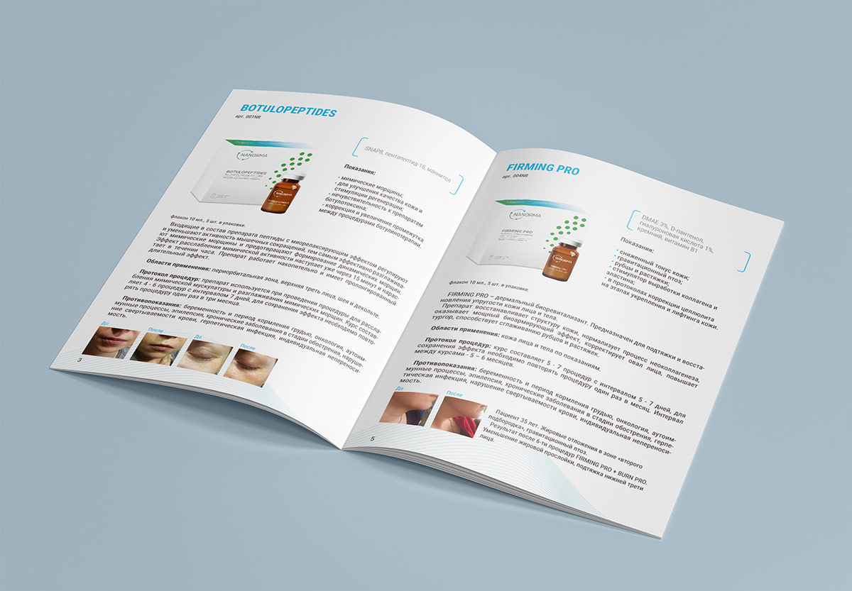 Разработка дизайна и верстка каталога была выполнена с учетом фирменного стиля бренда, который описан в бренд буке. Препараты французского бренда призваны сохранить молодость и улучшить состояние кожи. Продукты разработаны в современной лаборатории и произведены с применением инновационных технологий при соблюдении всех европейских стандартов качества. Они оказывают быстрый и продолжительный терапевтический результат благодаря направленному действию и точной концентрацией активных ингредиентов.