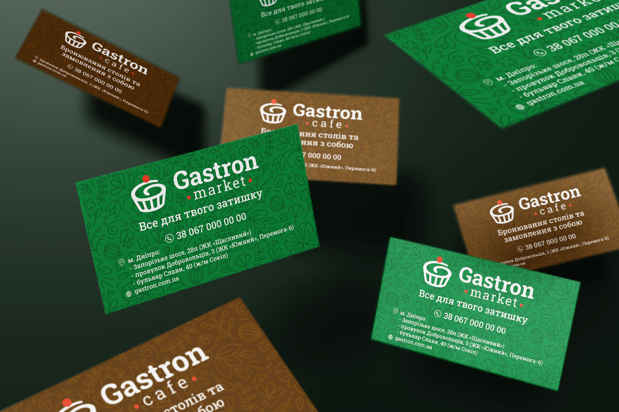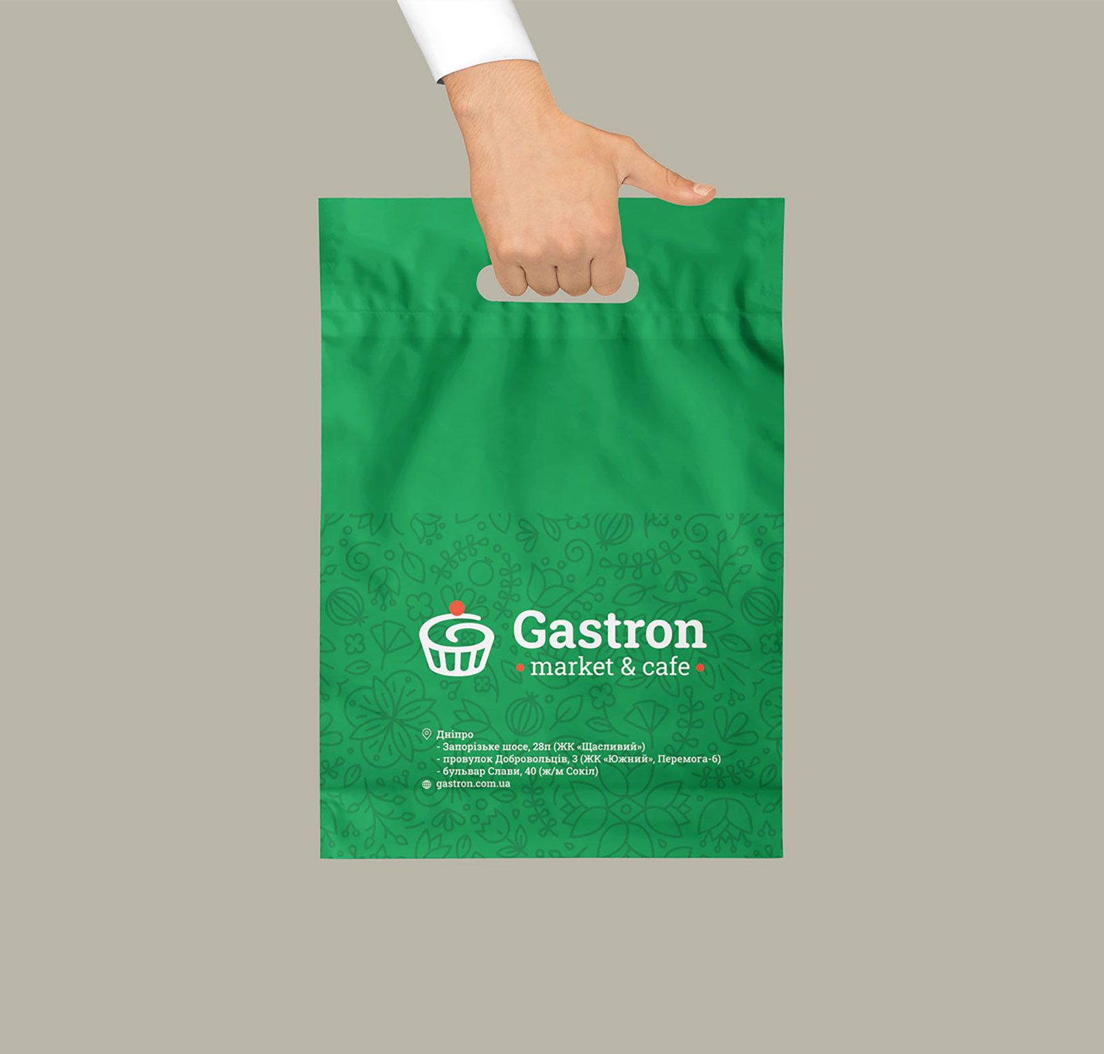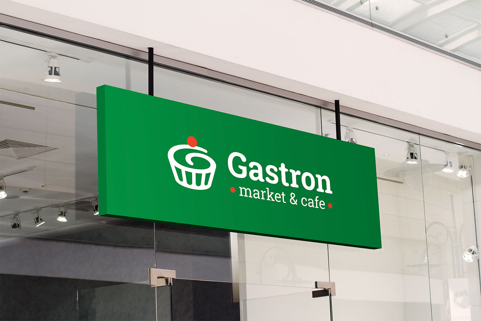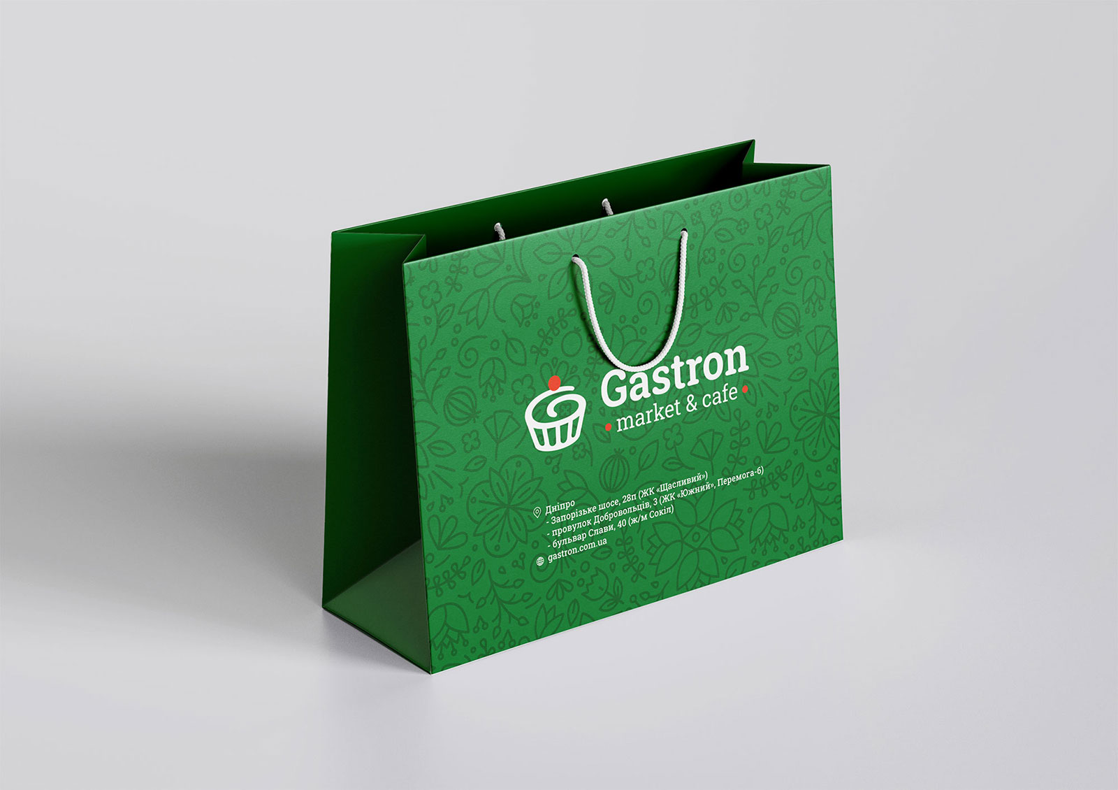 Шрифтовое написание названия "Gastron" разработано дизайнерами нашей студии и выполнено в строгом стиле. Для расшифровки деятельности было принято использовать в логотипе дескриптор “market”.