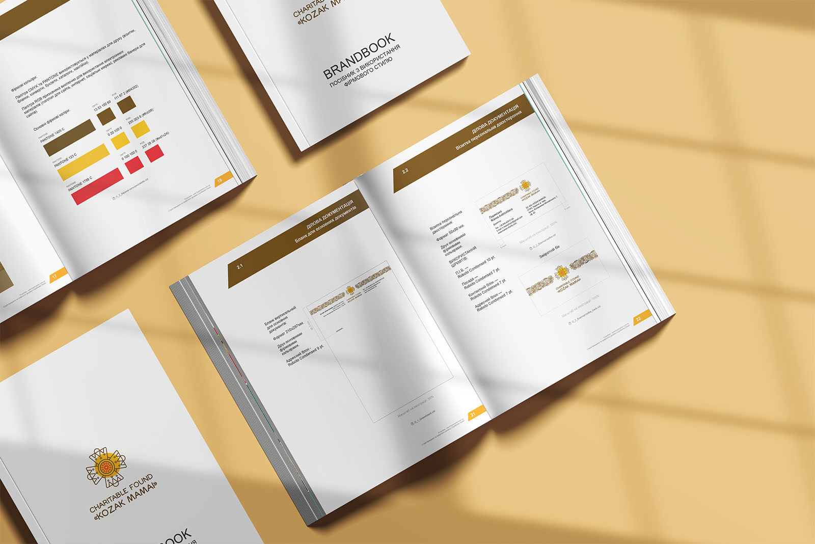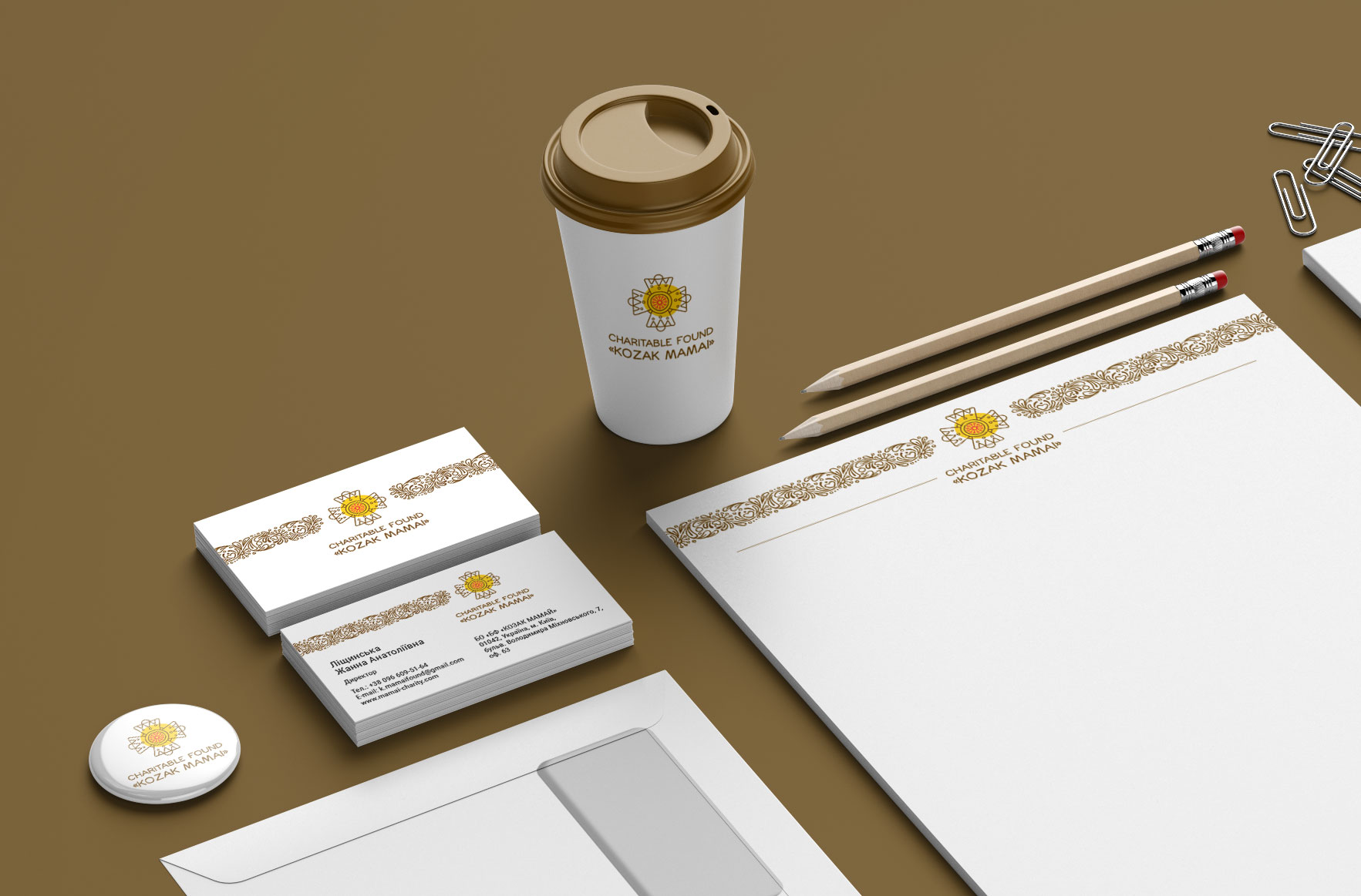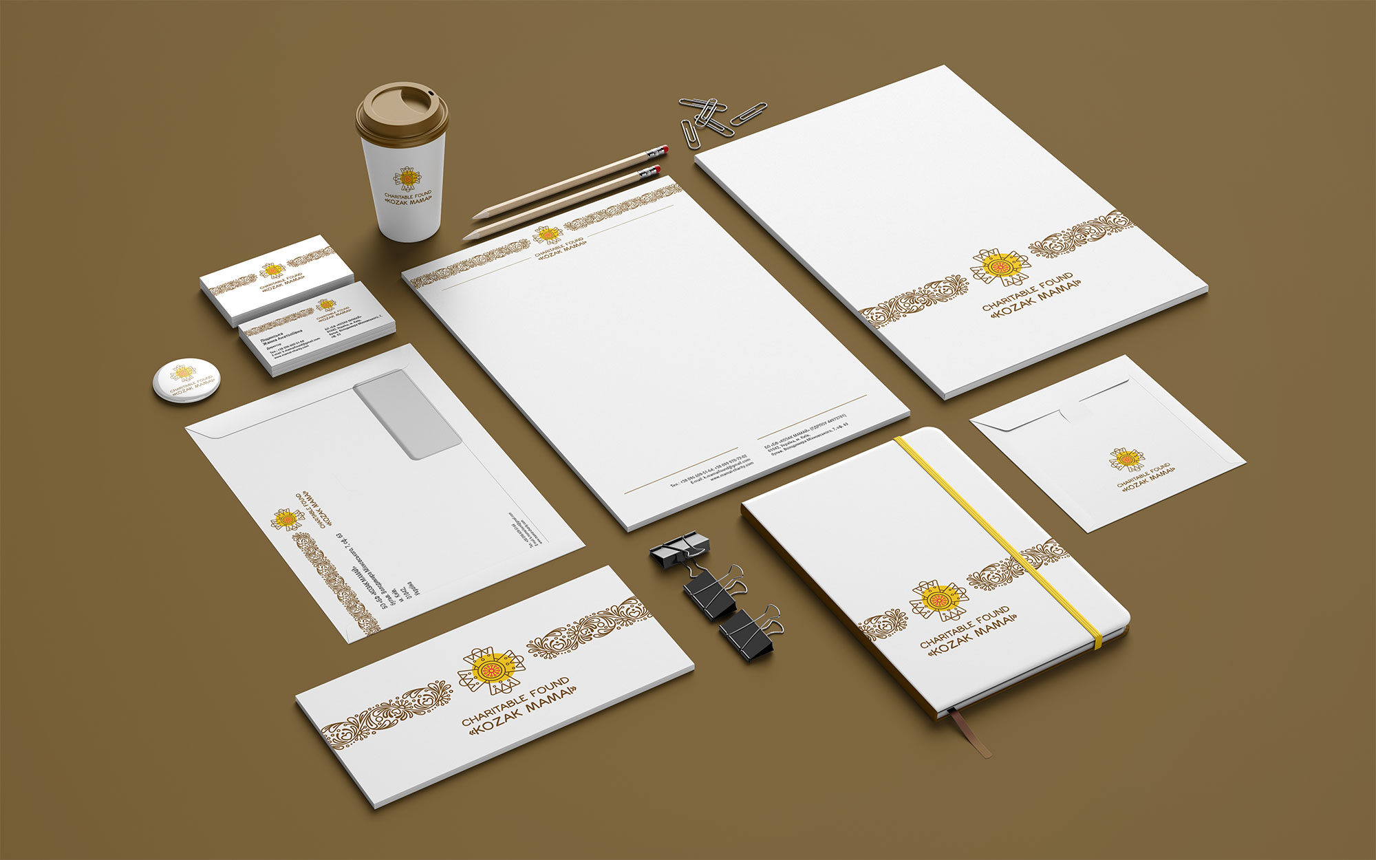 Шрифтовое написание названия "KOZAK MAMAI" было создано дизайнерами нашей студии специально для этого проекта. Он выполнен в сдержанном, уверенном стиле, подчеркивающем серьезность миссии Фонда. Для четкого понимания направления деятельности, к логотипу был добавлен дескриптор "CHARITABLE FUND" - как объяснение и одновременно официальное позиционирование Фонда на международном уровне.