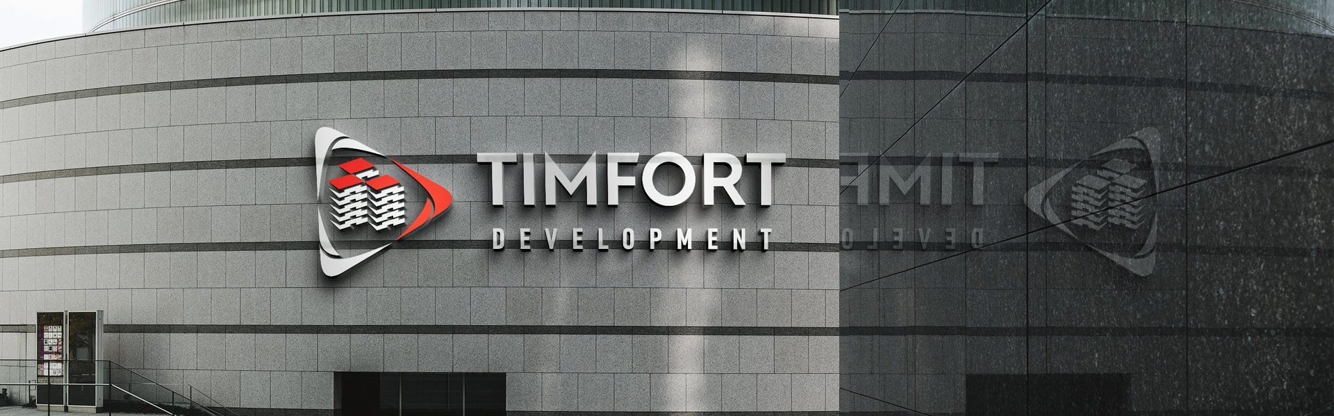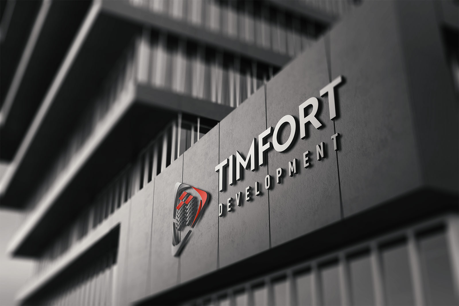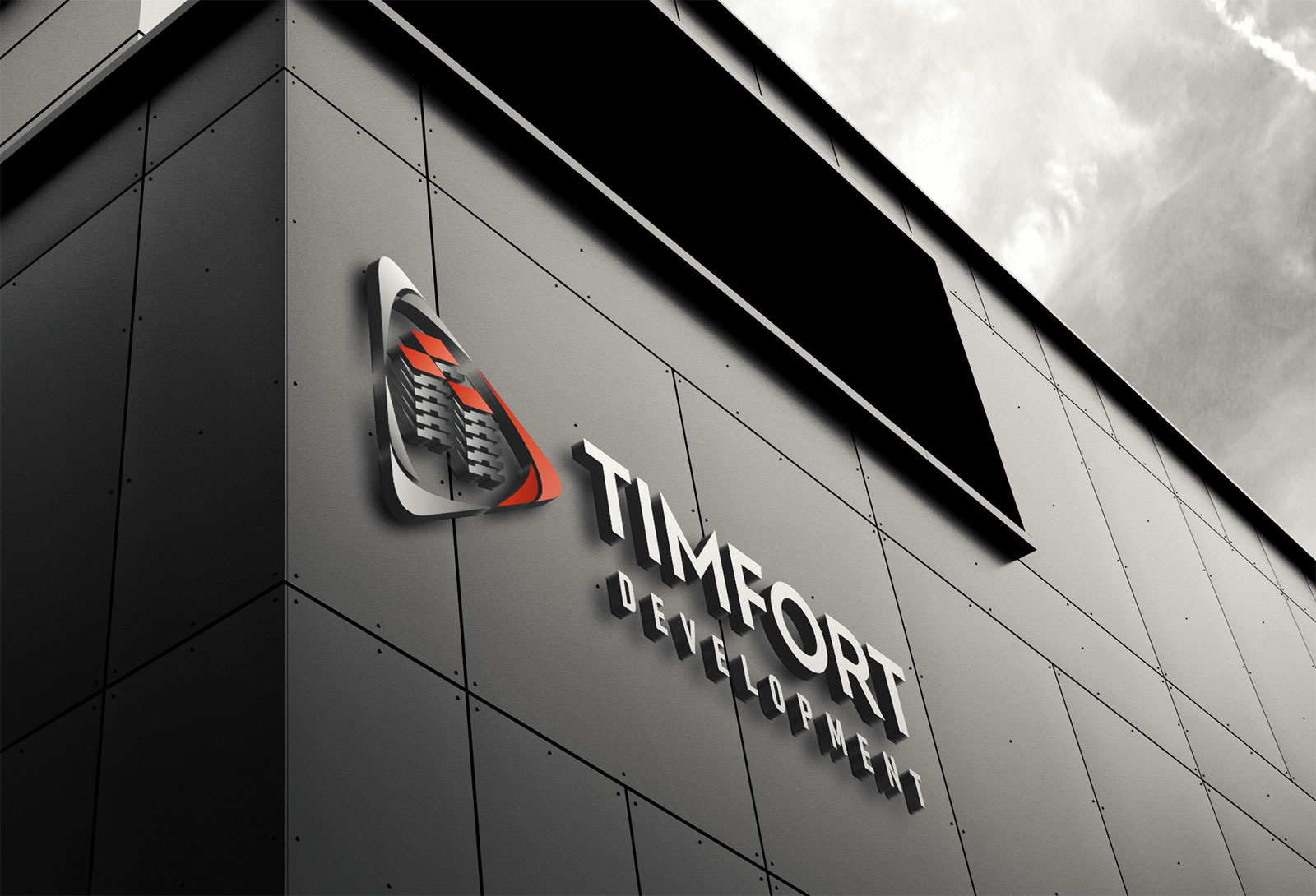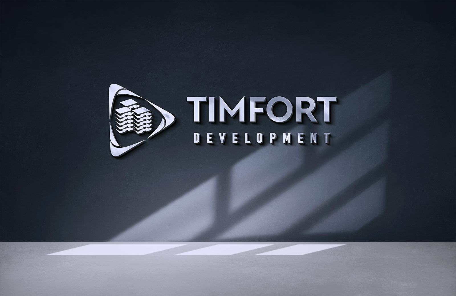 Шрифт написания названия компании “TIMFORT” был специально проработан дизайнерами студии и выполнено в строгом, геометрически выверенном стиле, что подчеркивает серьёзность и статус бренда. Для более чёткого позиционирования на рынке и расшифровки сферы деятельности, в логотип также был добавлен дескриптор “DEVELOPMENT”, который прямо указывает на ключевое направление деятельности компании — девелопмент и строительство современных объектов недвижимости.