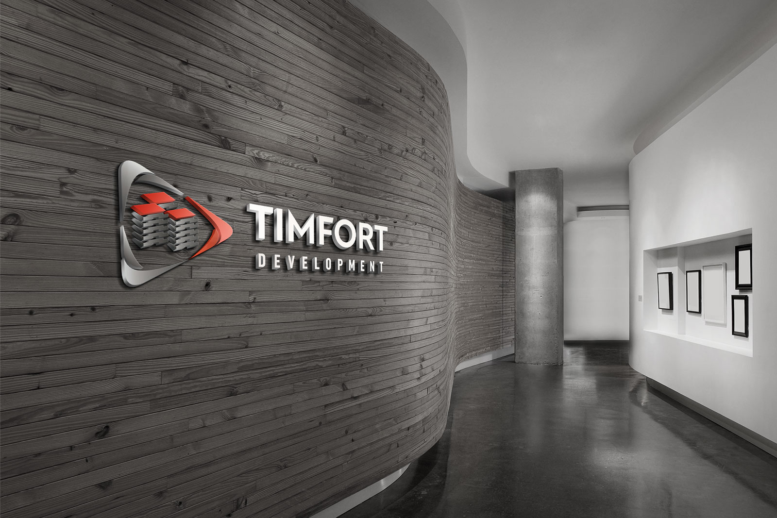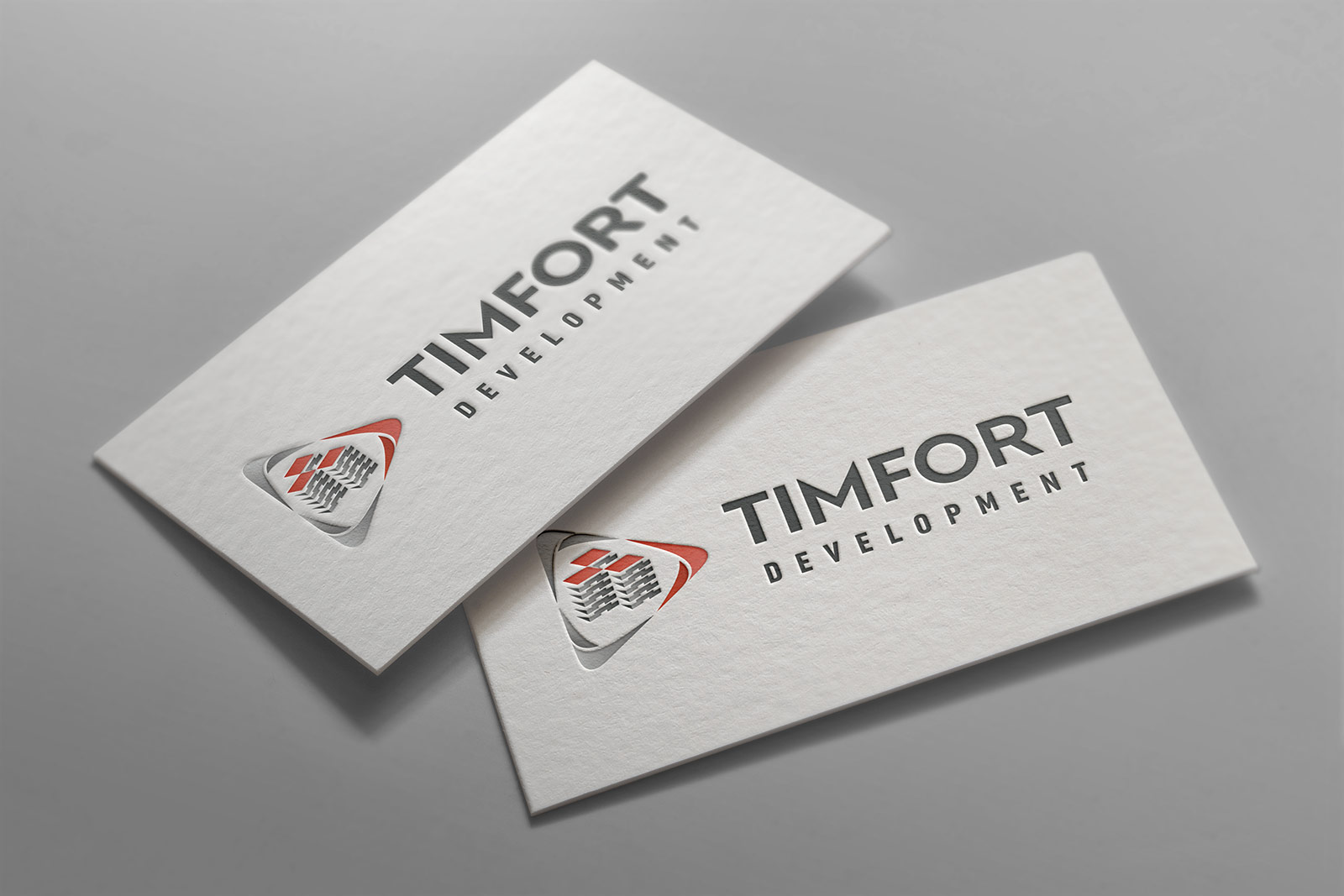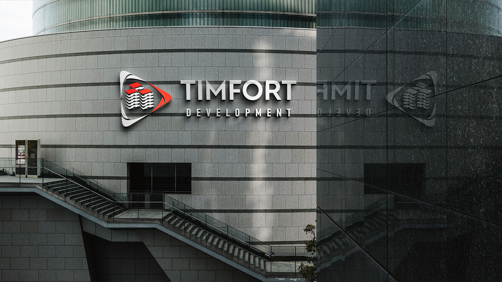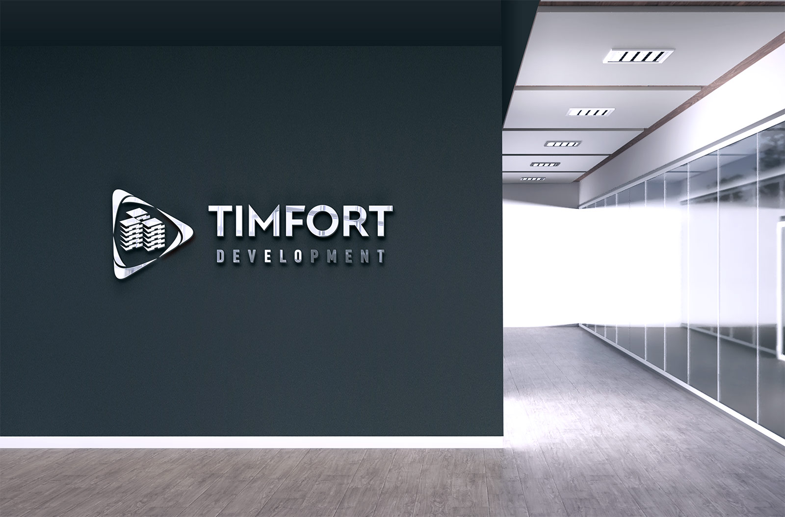 Шрифт написания названия компании “TIMFORT” был специально проработан дизайнерами студии и выполнено в строгом, геометрически выверенном стиле, что подчеркивает серьёзность и статус бренда. Для более чёткого позиционирования на рынке и расшифровки сферы деятельности, в логотип также был добавлен дескриптор “DEVELOPMENT”, который прямо указывает на ключевое направление деятельности компании — девелопмент и строительство современных объектов недвижимости.