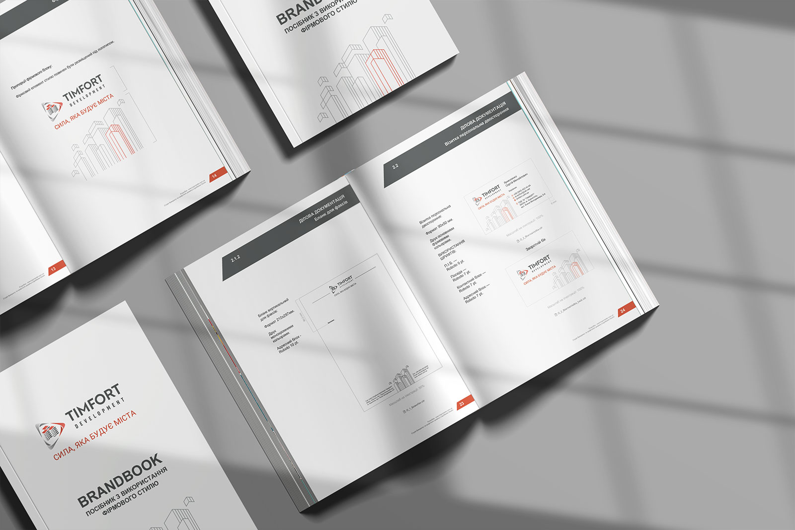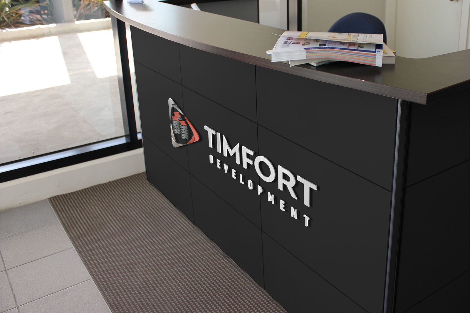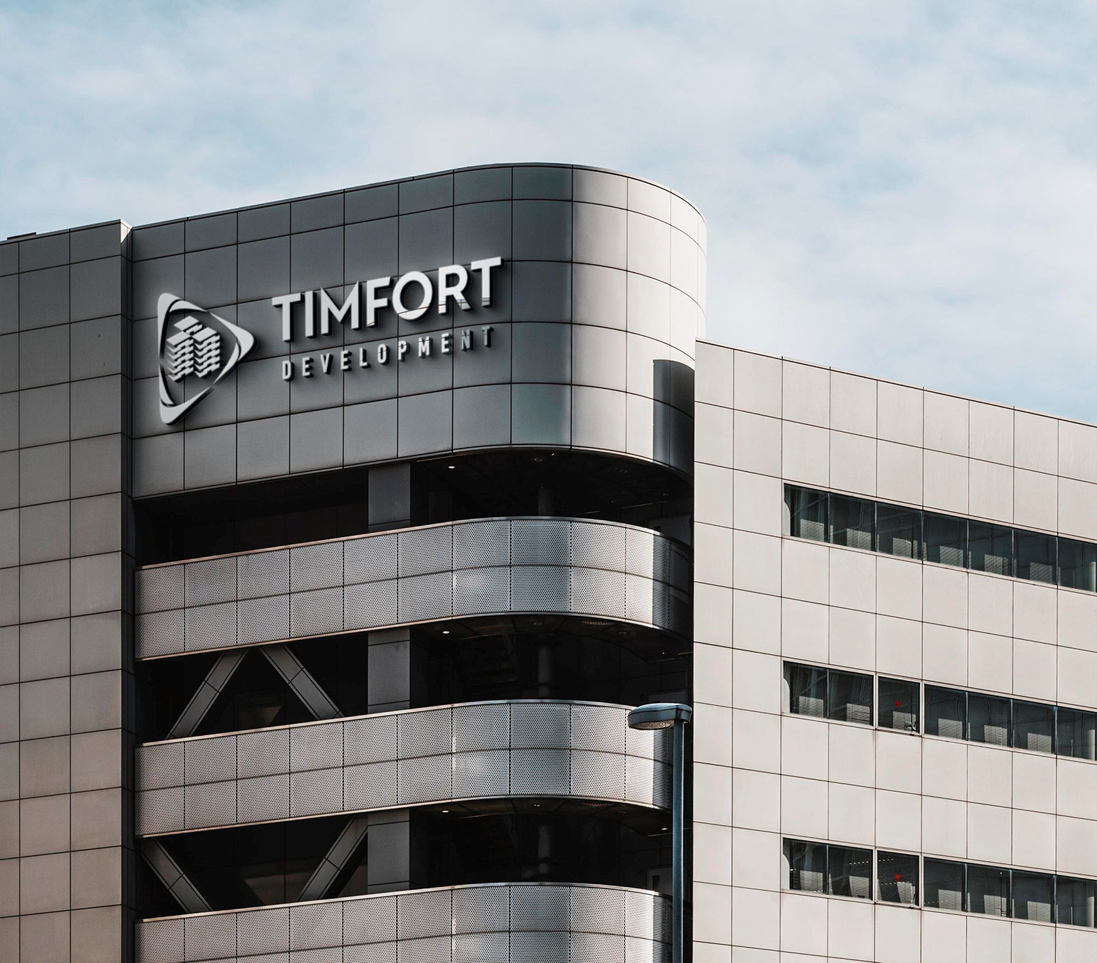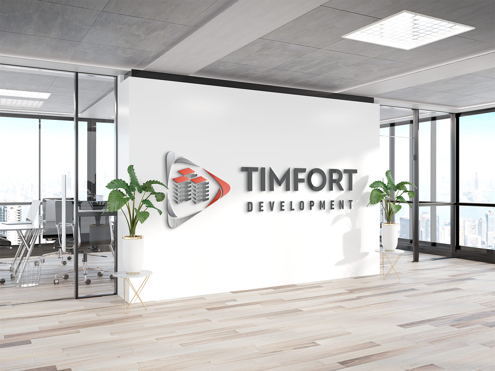 Шрифт написания названия компании “TIMFORT” был специально проработан дизайнерами студии и выполнено в строгом, геометрически выверенном стиле, что подчеркивает серьёзность и статус бренда. Для более чёткого позиционирования на рынке и расшифровки сферы деятельности, в логотип также был добавлен дескриптор “DEVELOPMENT”, который прямо указывает на ключевое направление деятельности компании — девелопмент и строительство современных объектов недвижимости.