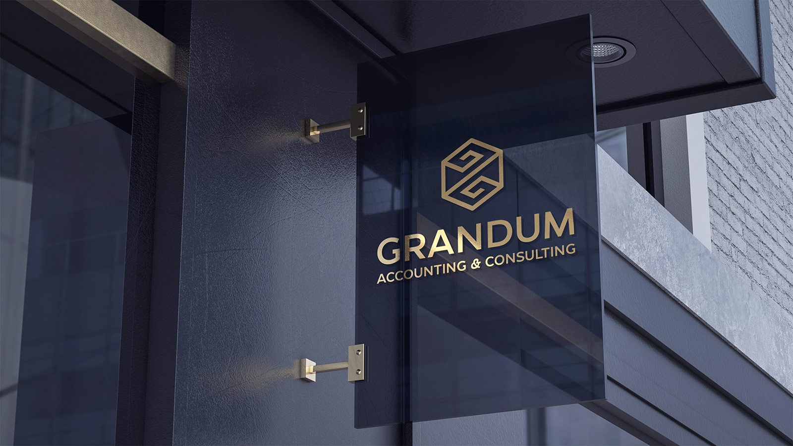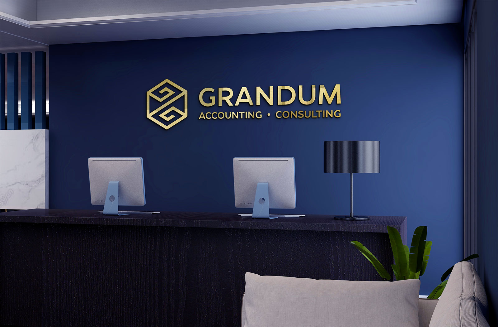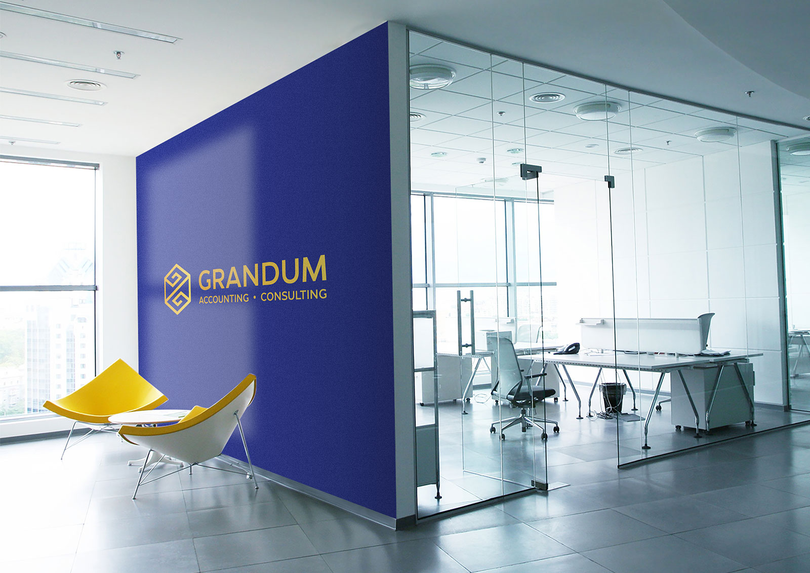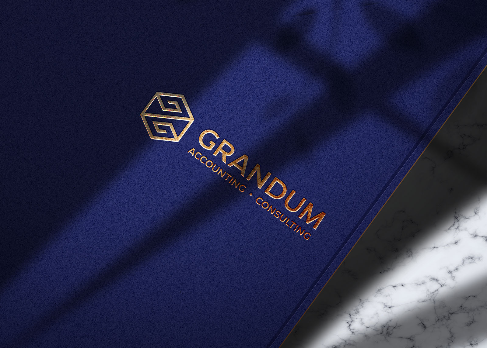 Шрифт написания названия компании “GRANDUM” был специально проработан дизайнерами студии и выполнено в строгом, геометрически выверенном стиле, что подчеркивает серьёзность и статус бренда. Для более чёткого позиционирования на рынке и расшифровки сферы деятельности, в логотип также был добавлен дескриптор “ACCOUNTING ? CONSULTING”, который прямо указывает на ключевое направление деятельности компании.