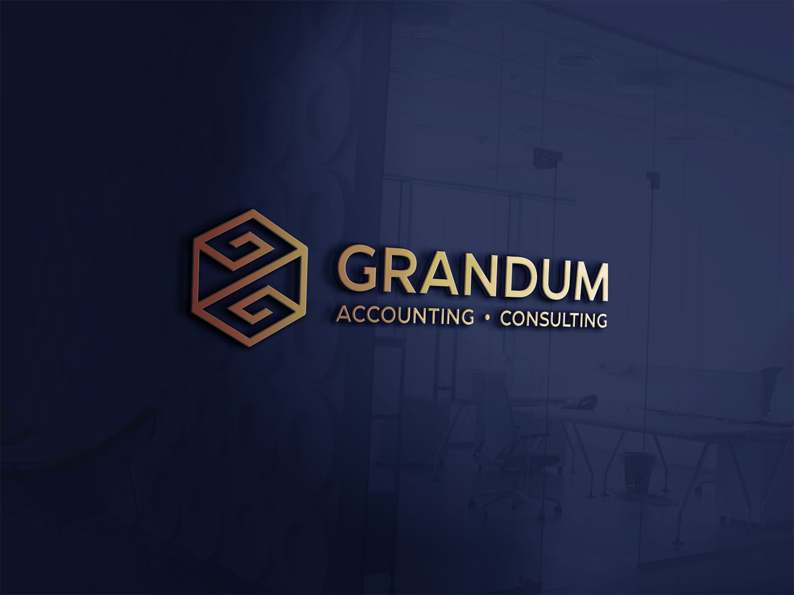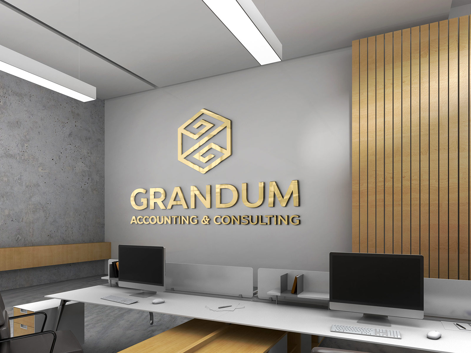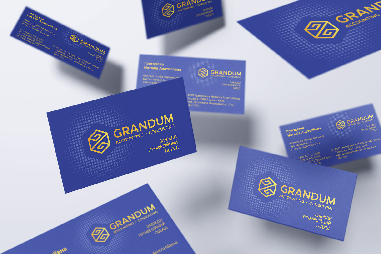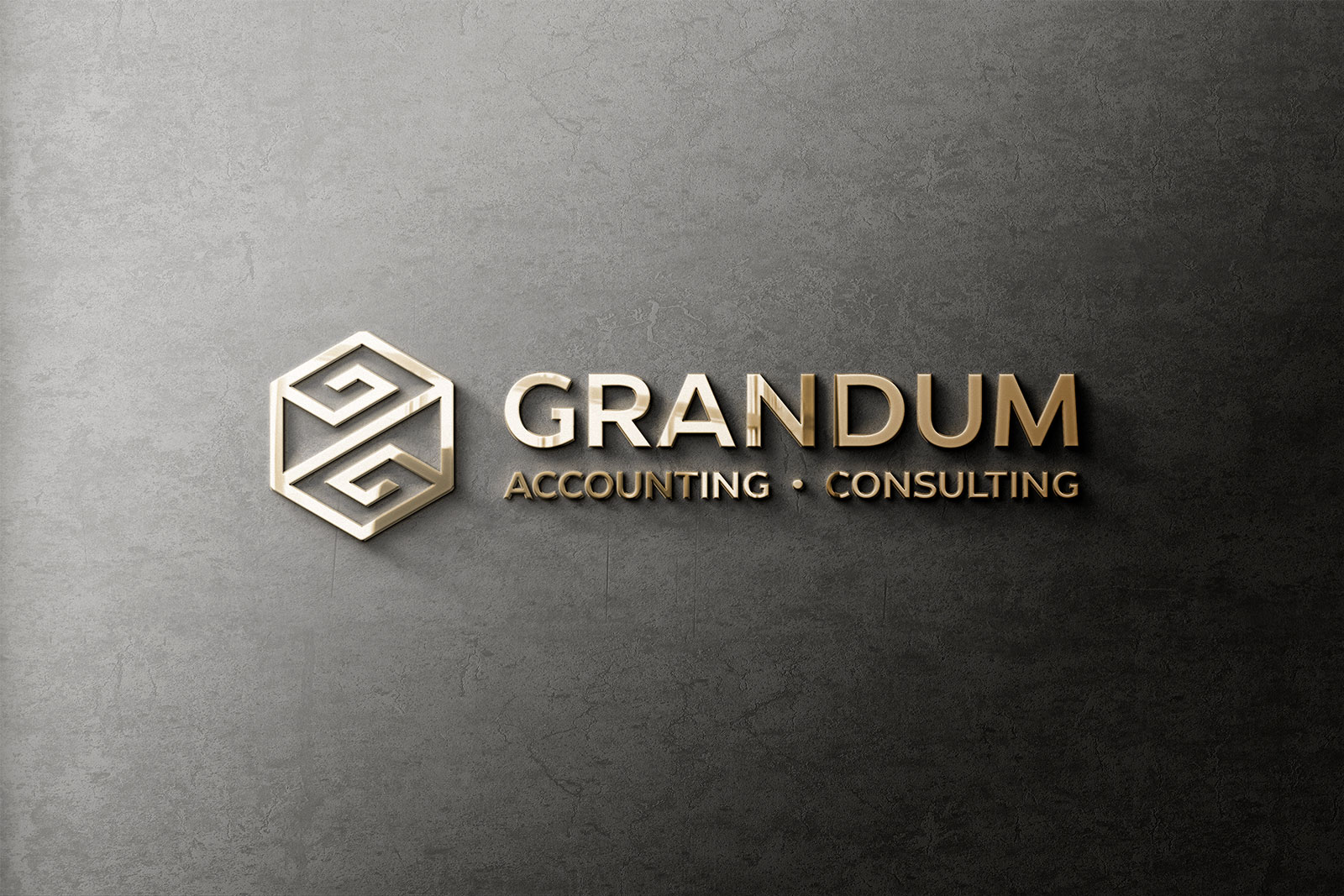 Шрифт написания названия компании “GRANDUM” был специально проработан дизайнерами студии и выполнено в строгом, геометрически выверенном стиле, что подчеркивает серьёзность и статус бренда. Для более чёткого позиционирования на рынке и расшифровки сферы деятельности, в логотип также был добавлен дескриптор “ACCOUNTING ? CONSULTING”, который прямо указывает на ключевое направление деятельности компании.