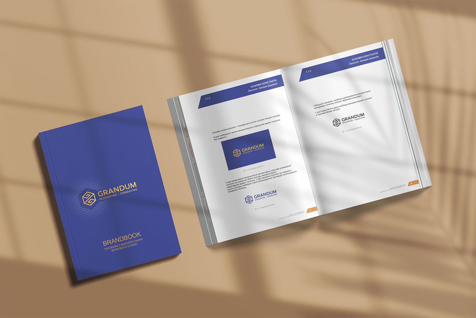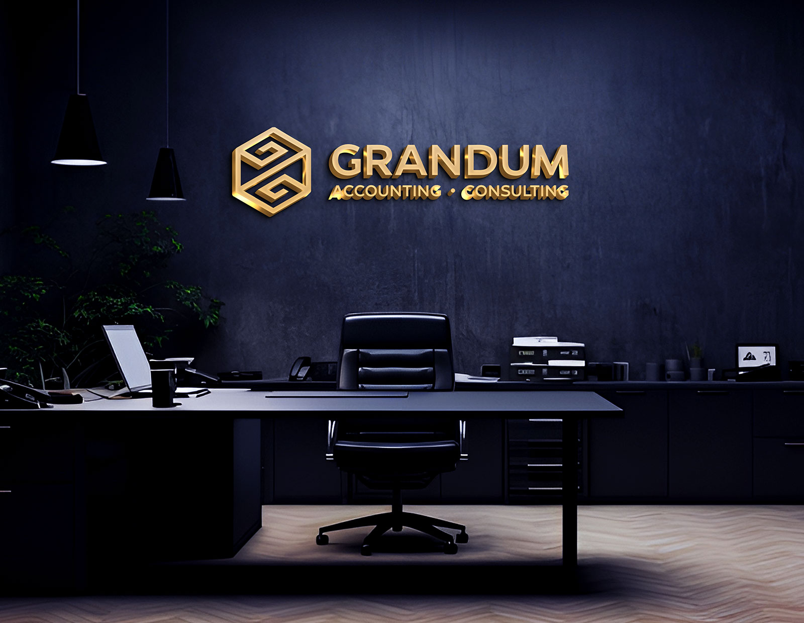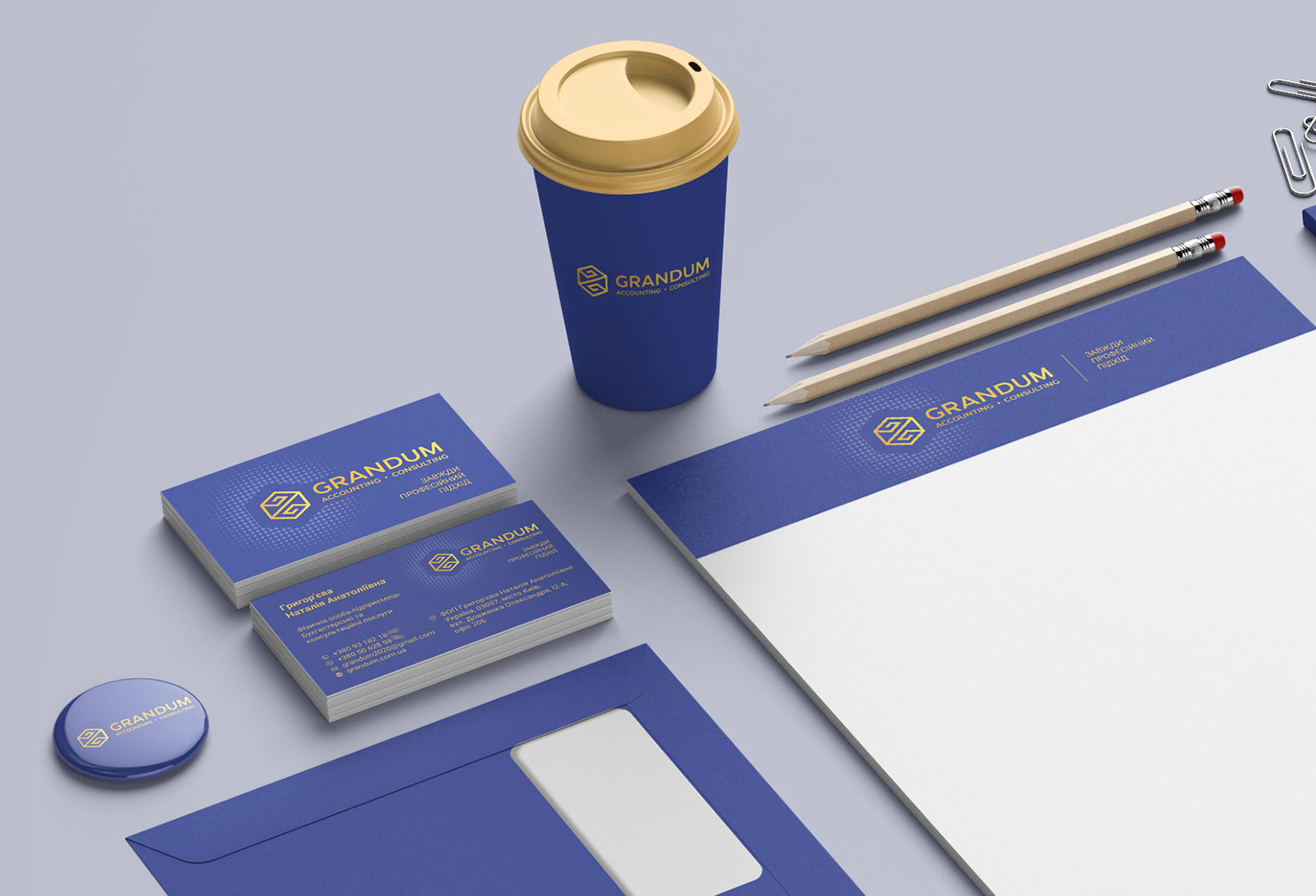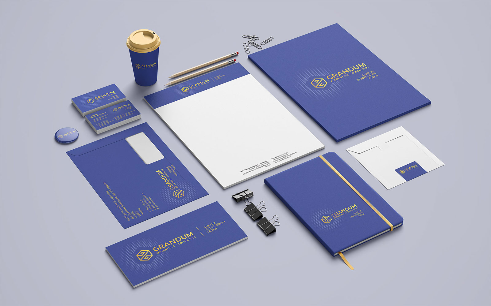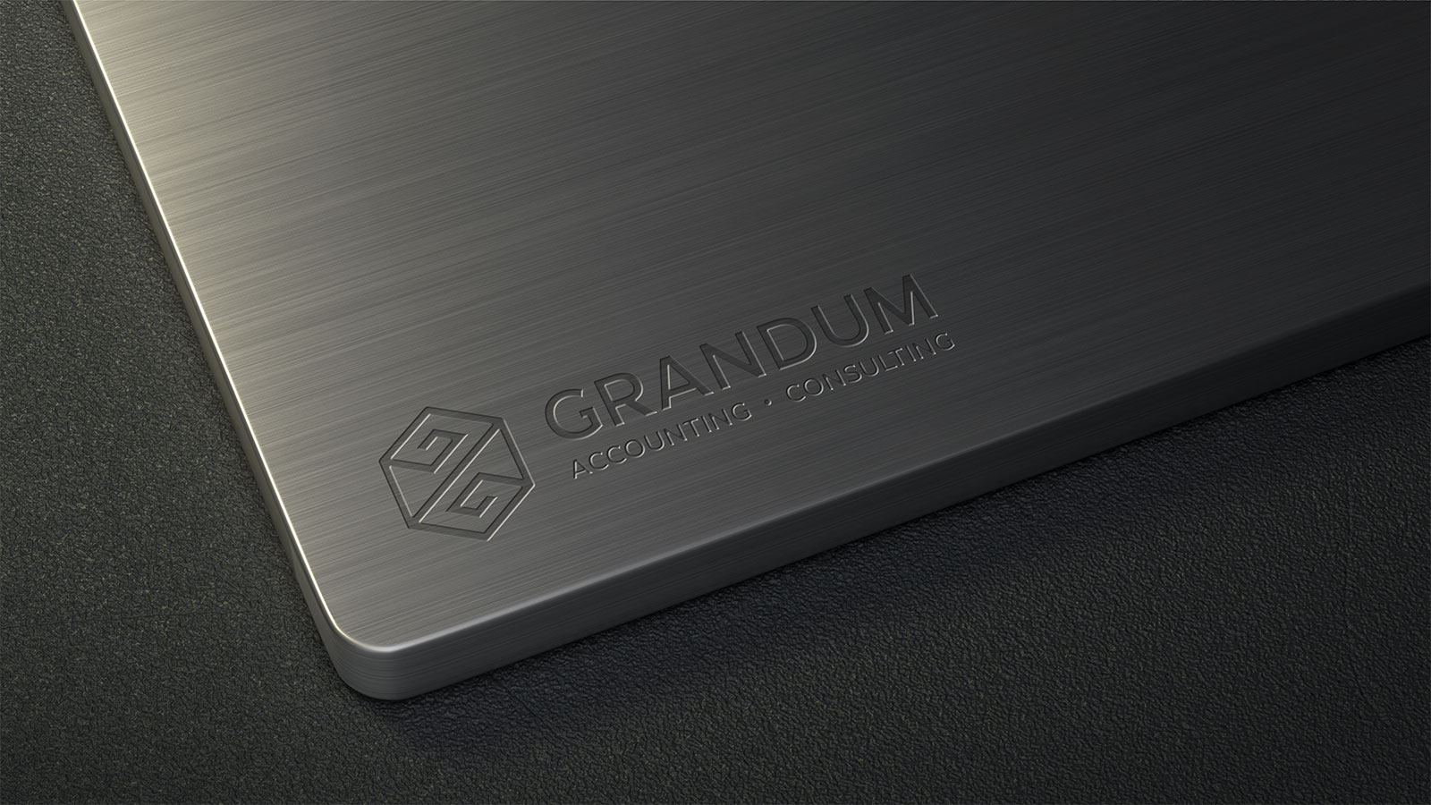 Шрифт написания названия компании “GRANDUM” был специально проработан дизайнерами студии и выполнено в строгом, геометрически выверенном стиле, что подчеркивает серьёзность и статус бренда. Для более чёткого позиционирования на рынке и расшифровки сферы деятельности, в логотип также был добавлен дескриптор “ACCOUNTING ? CONSULTING”, который прямо указывает на ключевое направление деятельности компании.