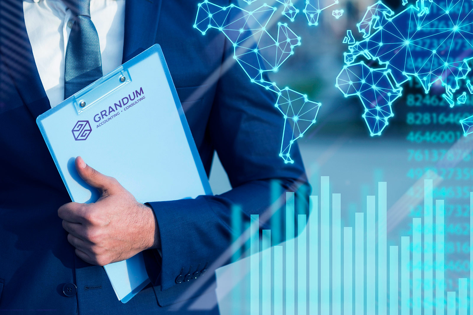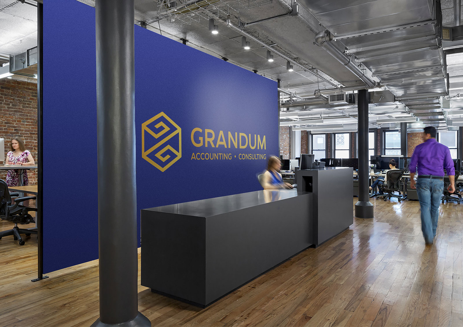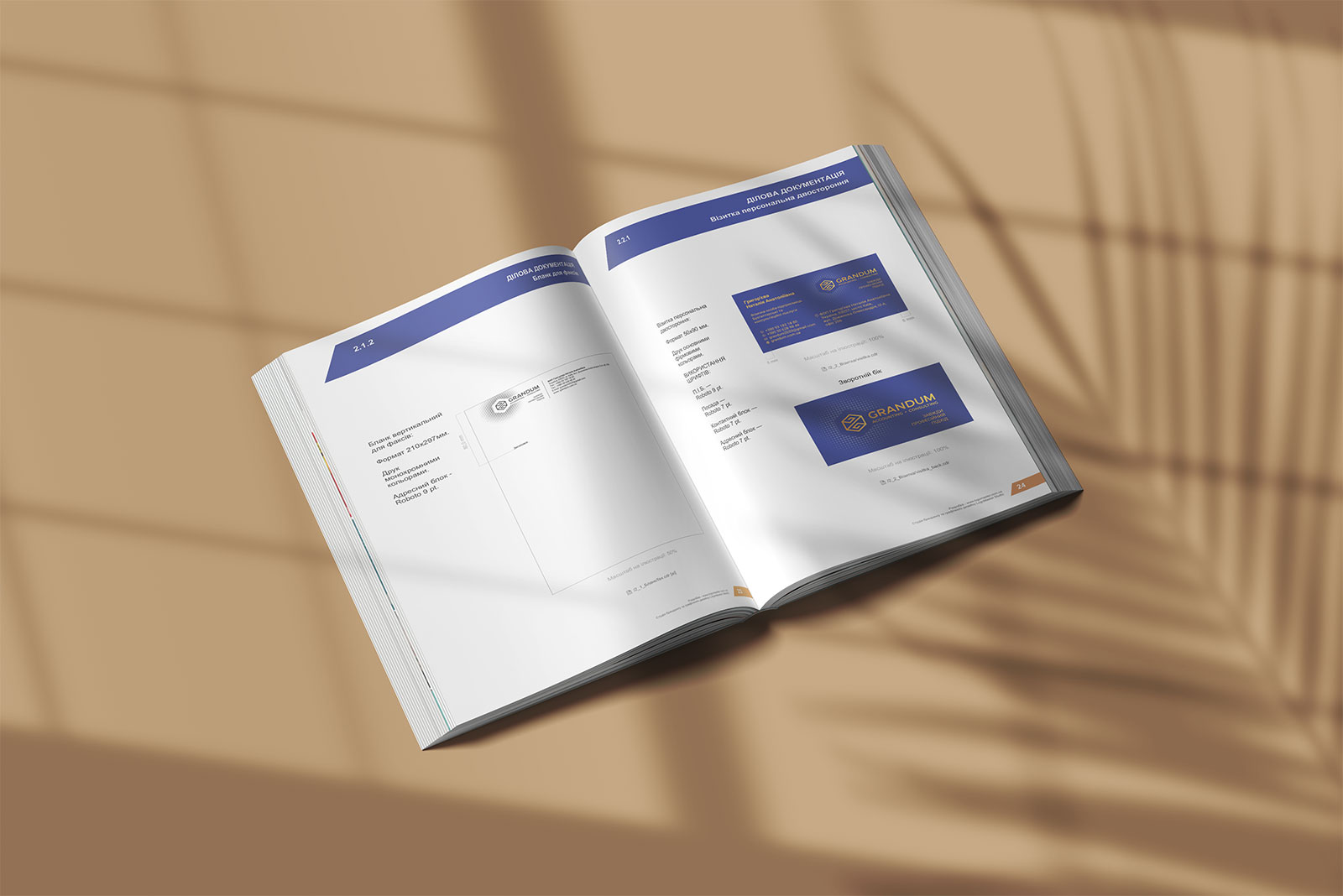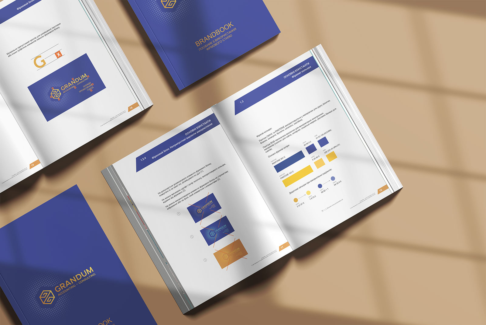 Шрифт написания названия компании “GRANDUM” был специально проработан дизайнерами студии и выполнено в строгом, геометрически выверенном стиле, что подчеркивает серьёзность и статус бренда. Для более чёткого позиционирования на рынке и расшифровки сферы деятельности, в логотип также был добавлен дескриптор “ACCOUNTING ? CONSULTING”, который прямо указывает на ключевое направление деятельности компании.