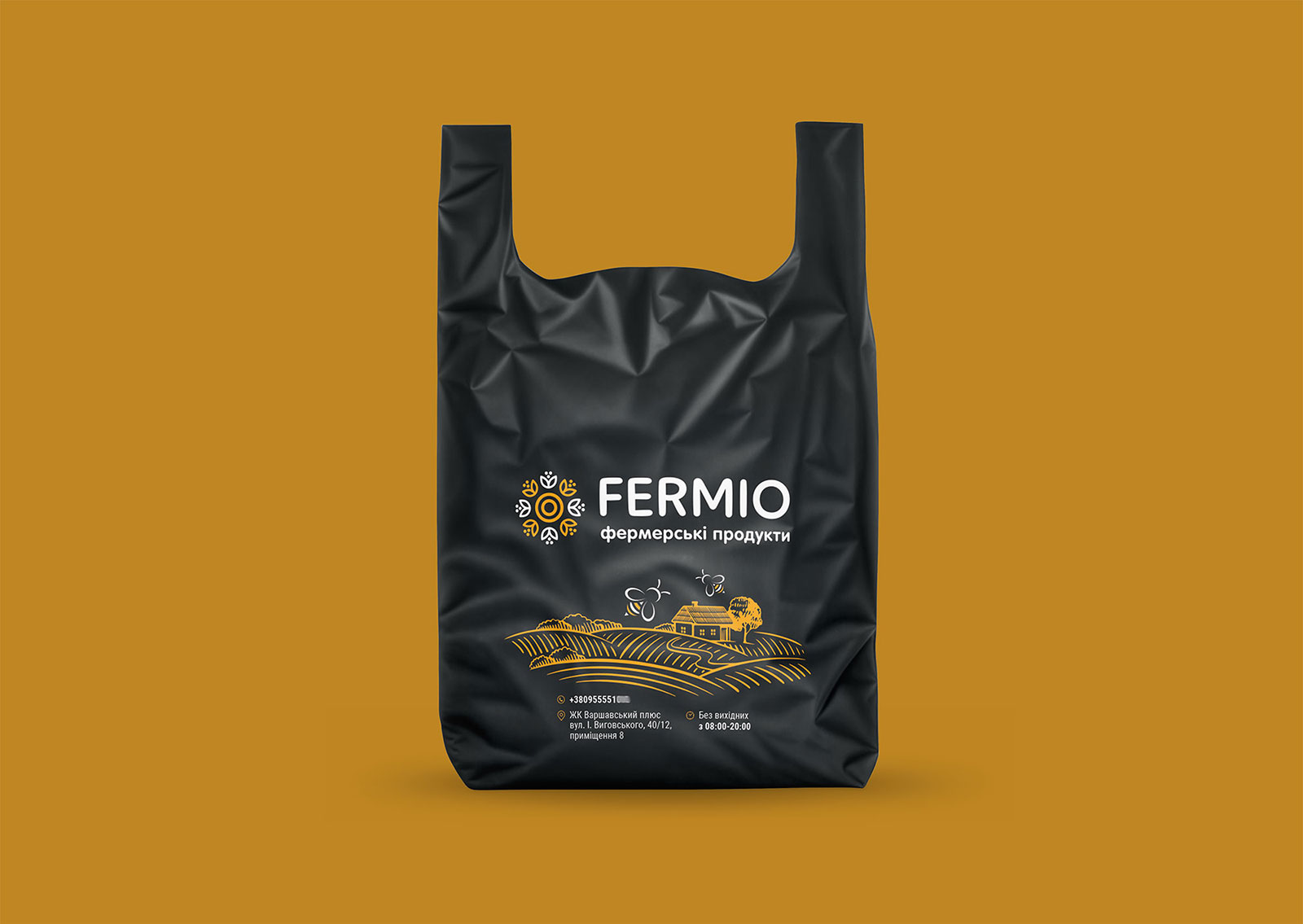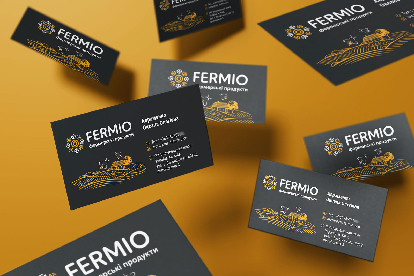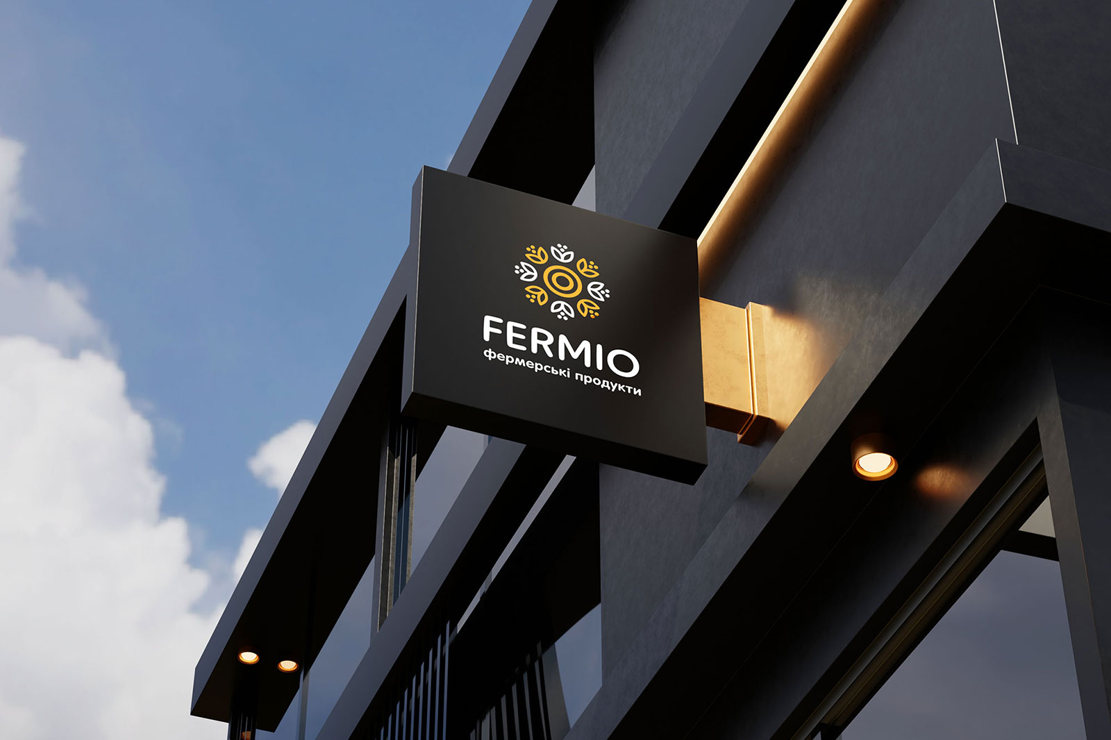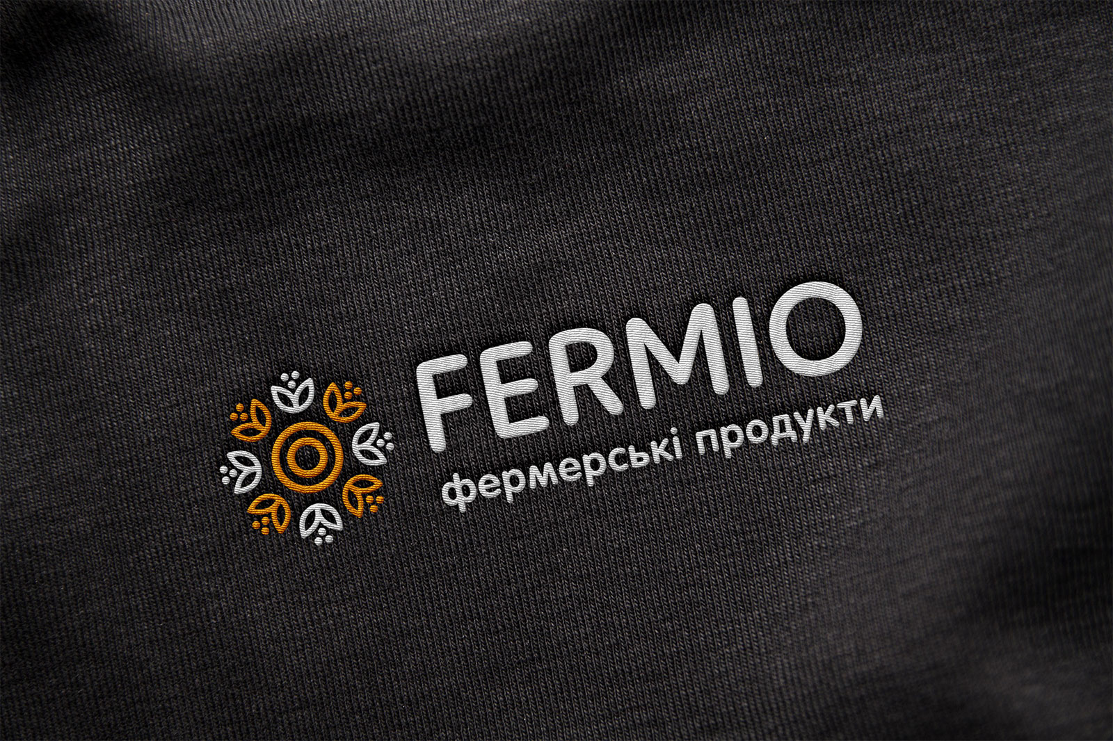 Шрифтовое написание названия «FERMIO» разработано в строгом, но современном стиле, что подчеркивает устойчивость и надежность компании, сохраняя при этом актуальность и динамичность визуального образа. Для большей ясности и идентификации направления деятельности был добавлен дескриптор «фермерські продукти», который помогает сразу донести суть бренда до аудитории.