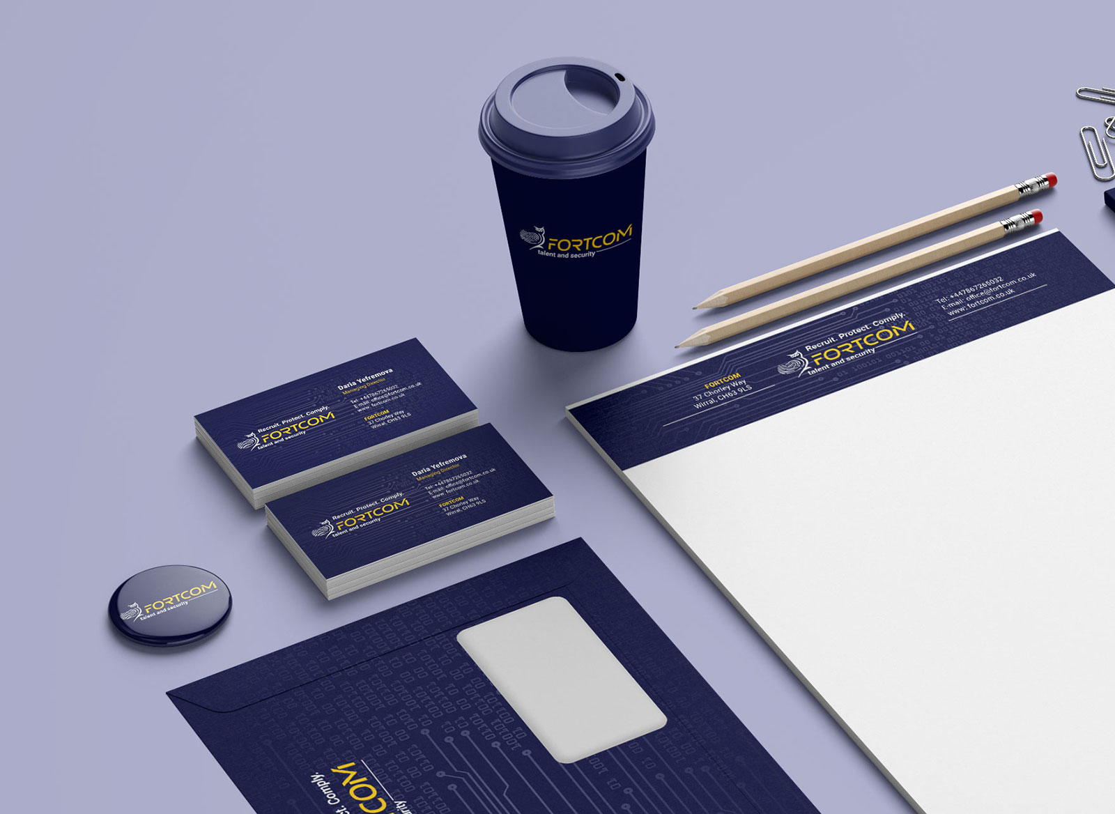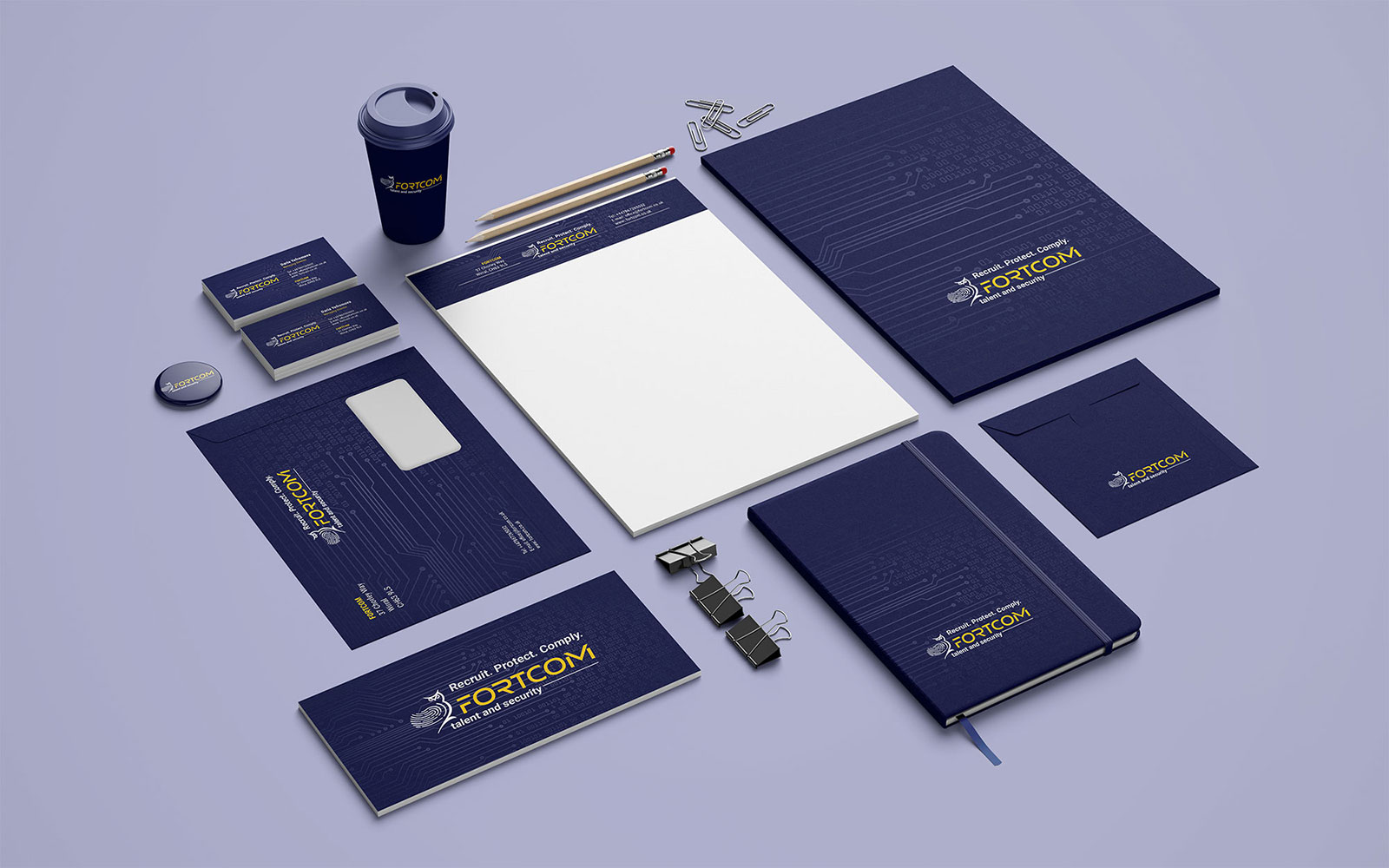 Каждый носитель оформлен с учётом фирменных цветов, типографики и графических элементов, чтобы бренд FORTCOM выглядел профессионально, стильно и единообразно во всех точках контакта с аудиторией — от электронных писем до корпоративных встреч.