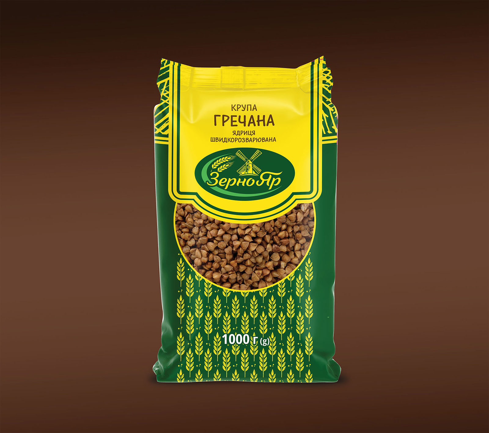 Упаковка выделяется на полке за счёт цвета и орнамента, при этом сохраняет ощущение домашнего, качественного продукта. Это не просто пакет крупы — это визуальная история о земле, зерне и силе природы.