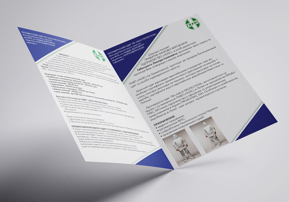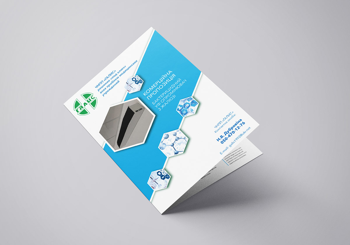 Розробка концепції дизайну та оформлення комерційної пропозиції (КП) для ПНВП «ГАЛІС» – рішення «під ключ» усіх проблем медичних закладів. Компанія «ГАЛІС» – це підприємство, яке спеціалізується на постачанні товарів медичного призначення для державних та приватних установ. Основні групи: медикаменти, медичне та лабораторне обладнання, мікроскопи, аналізатори, медичні та лабораторні меблі, дезінфекційні засоби, медичний одяг, повний спектр товарів для стоматології - від установки до пульпоекстрактора, одноразові вироби (шприци, рукавички, перев'язка, клейонка тощо) .).