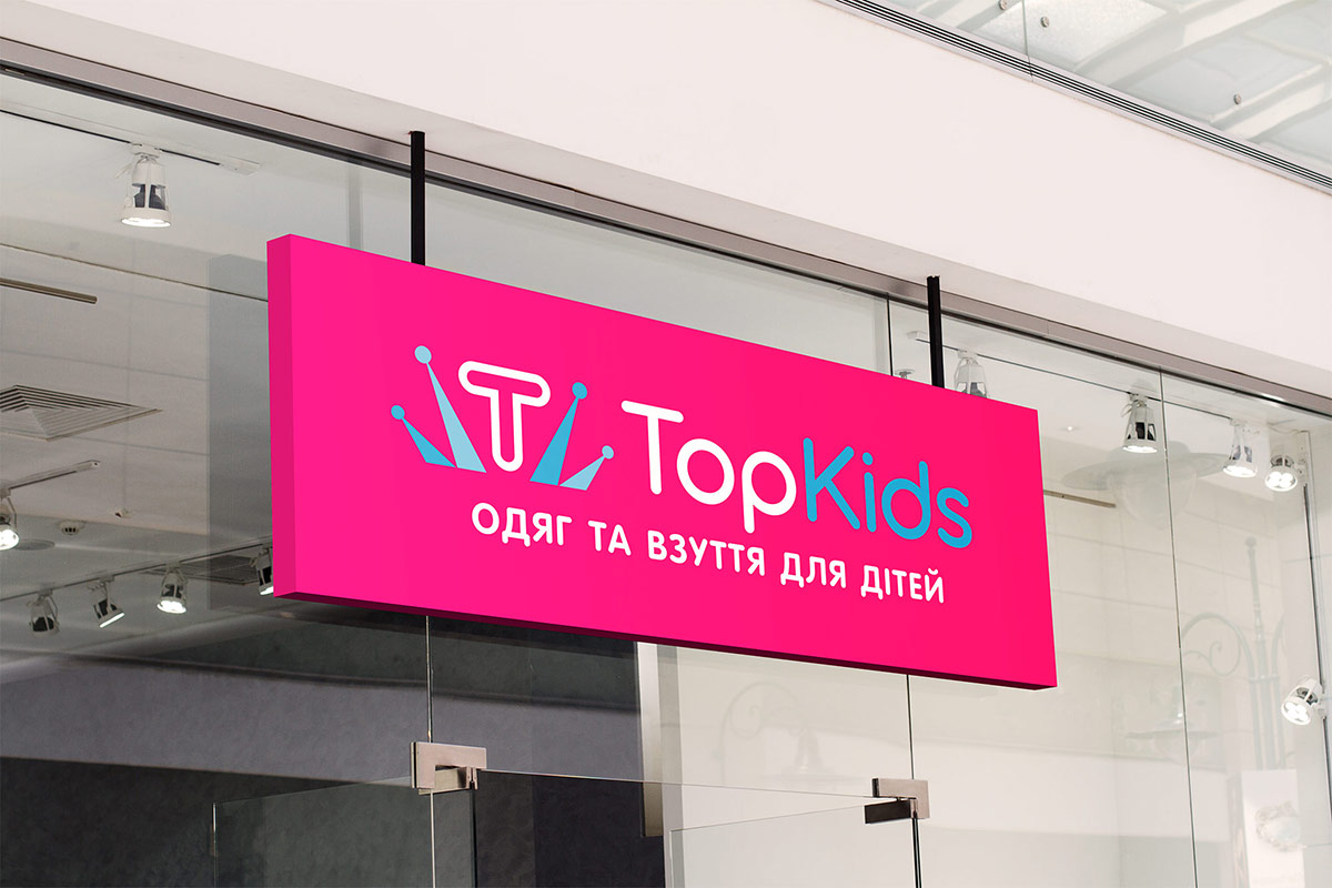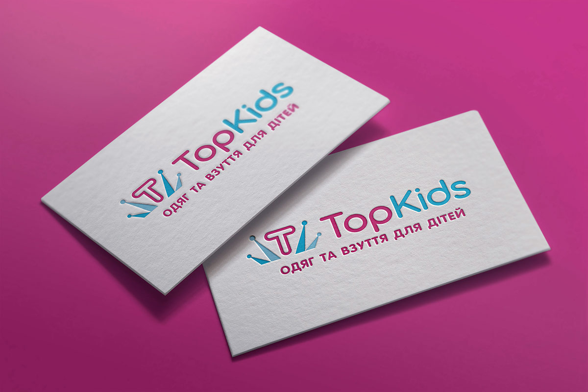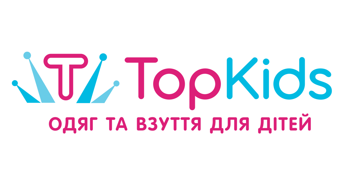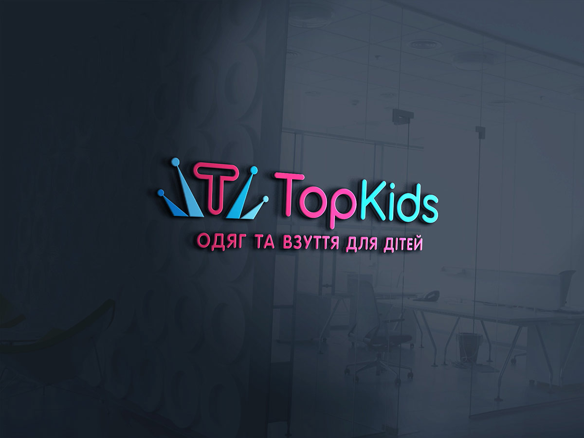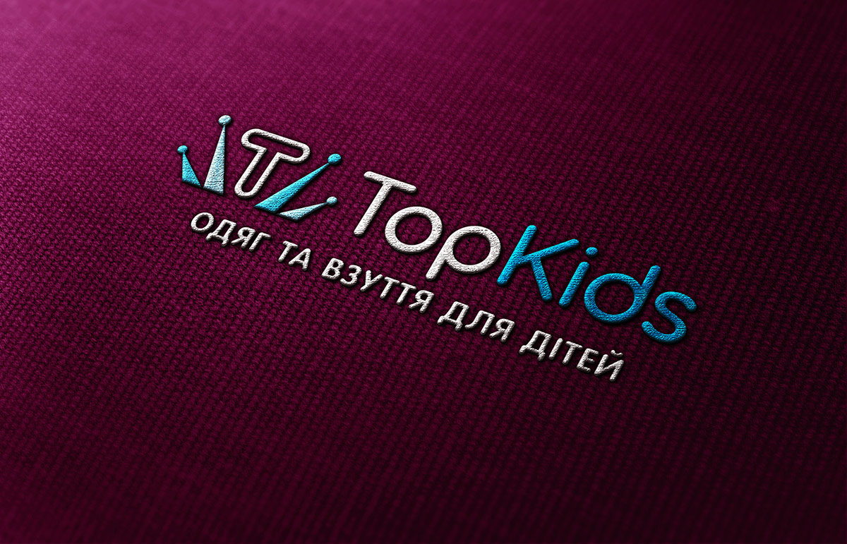 Розроблений логотип виконаний у вигляді знака в якому зображена буква Т та відкрита корона, яка підкреслює високу якість товару в магазині. Шрифтове написання назви “TopKids” розроблено дизайнерами нашої студії та виконане у строгому стилі. Для розшифровки діяльності було прийнято використовувати в логотипі дескриптор “ОДЯГА ТА ВЗУТТЯ ДЛЯ ДІТЕЙ”.
