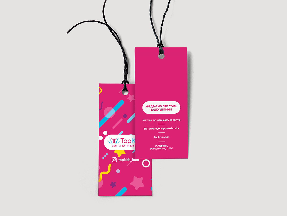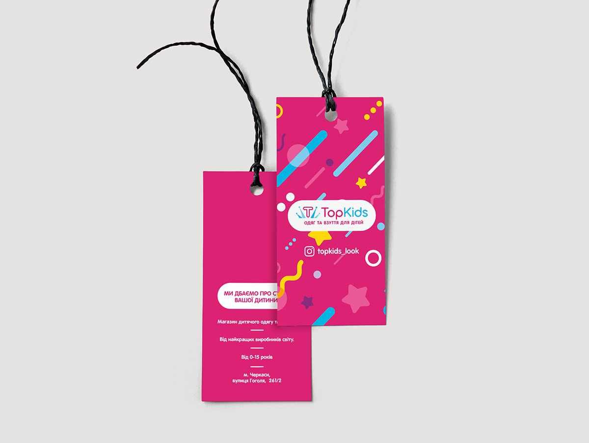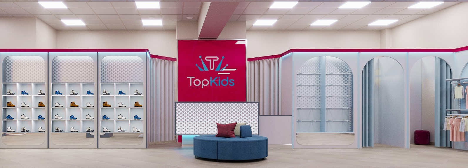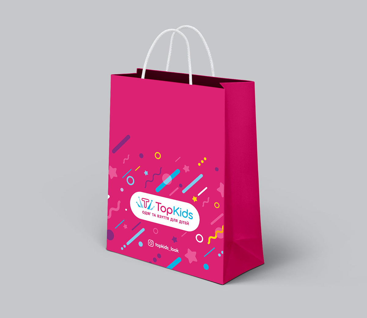 Розроблений логотип виконаний у вигляді знака в якому зображена буква Т та відкрита корона, яка підкреслює високу якість товару в магазині. Шрифтове написання назви “TopKids” розроблено дизайнерами нашої студії та виконане у строгому стилі. Для розшифровки діяльності було прийнято використовувати в логотипі дескриптор “ОДЯГА ТА ВЗУТТЯ ДЛЯ ДІТЕЙ”.